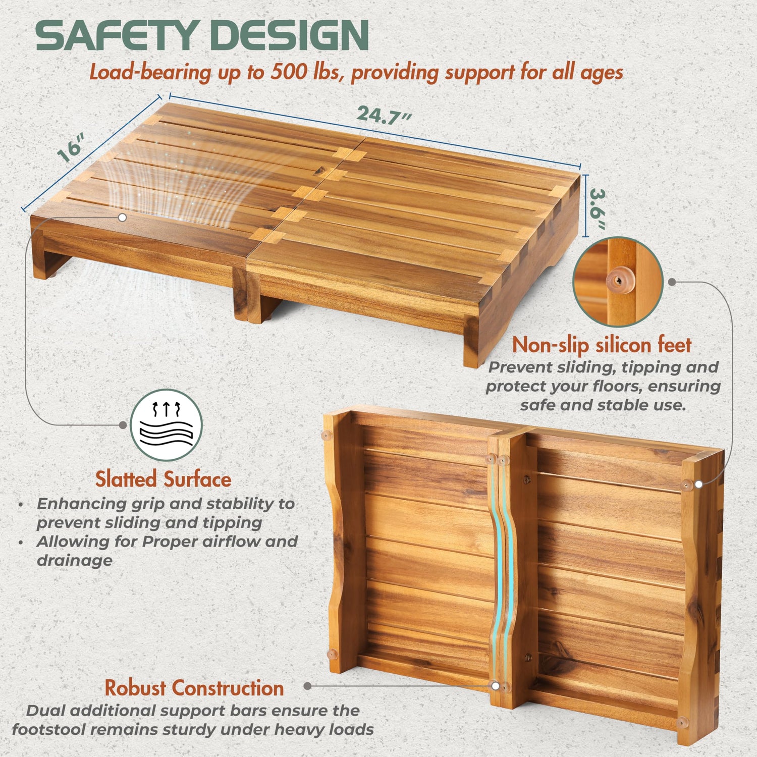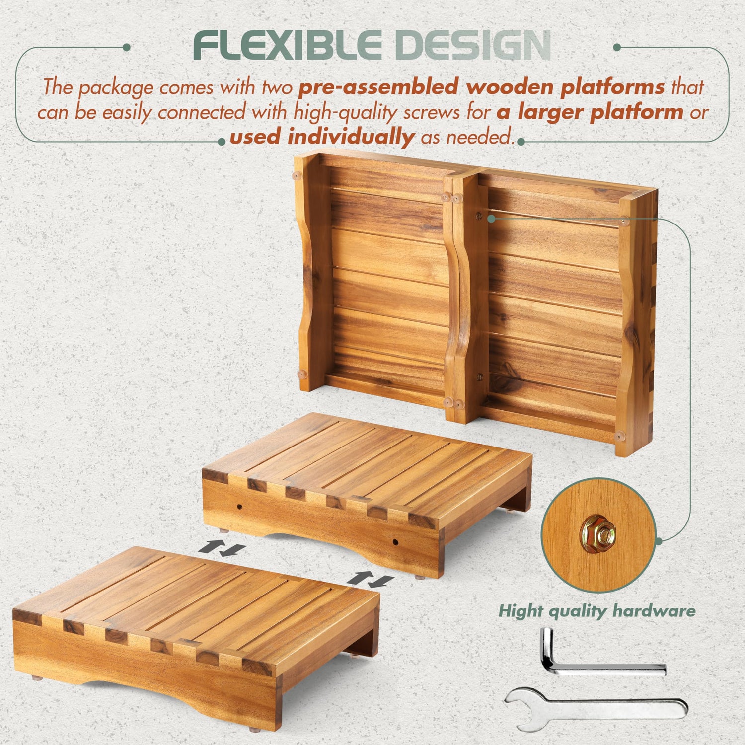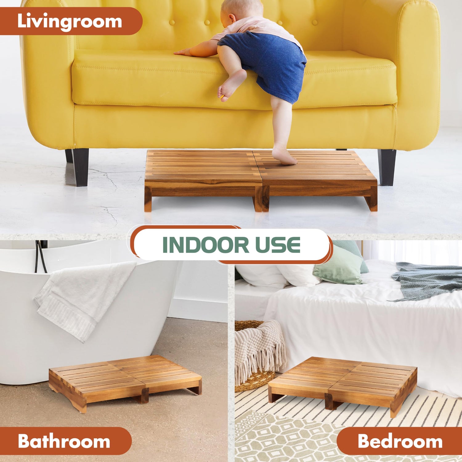 - 🌳 Strength of Natural Acacia Wood: Crafted from premium Acacia wood, this step stool is not only water-resistant but also scratch-resistant, ensuring durability and longevity. The slatted surface enhances airflow and drainage, preventing moisture accumulation, making it suitable for both indoor and outdoor use.