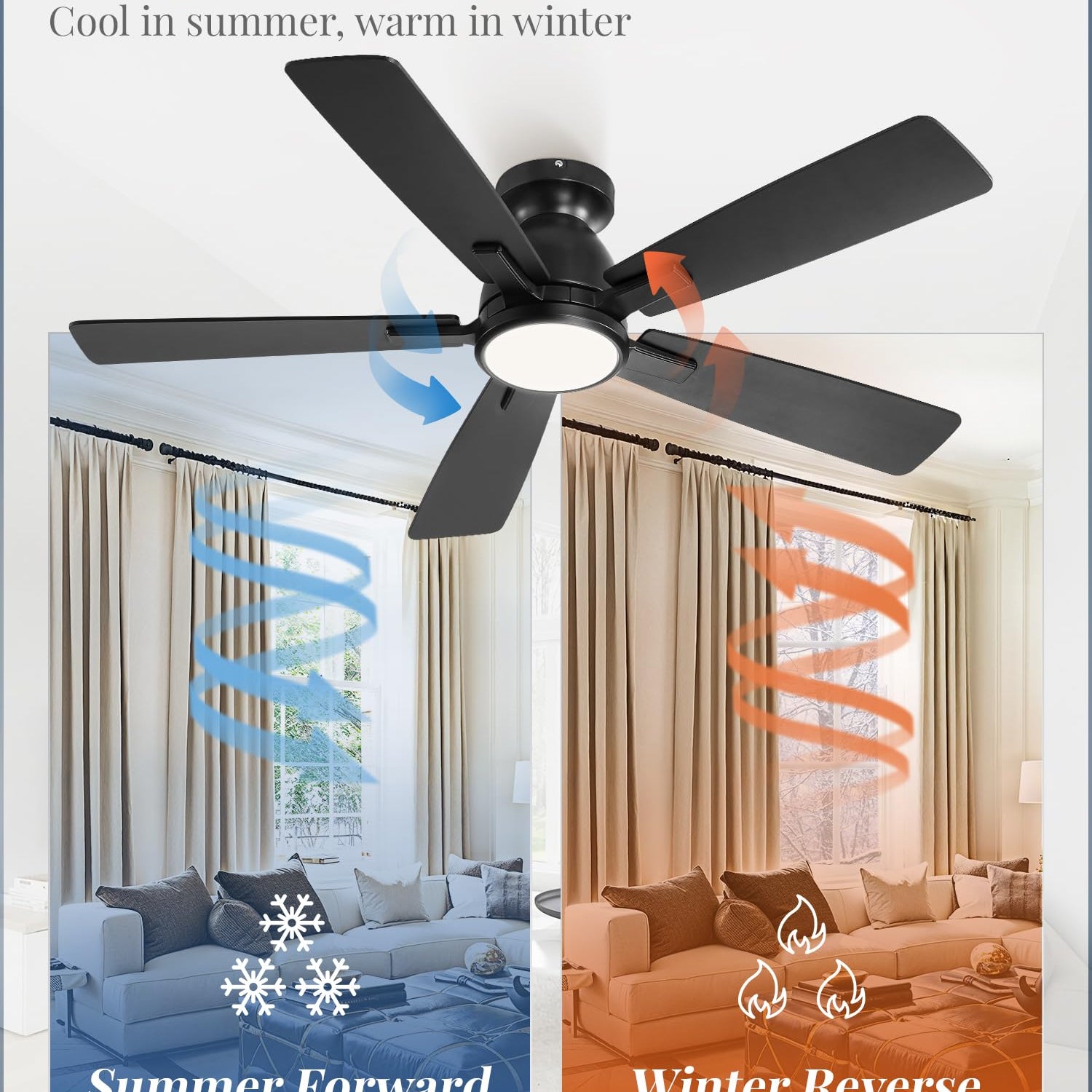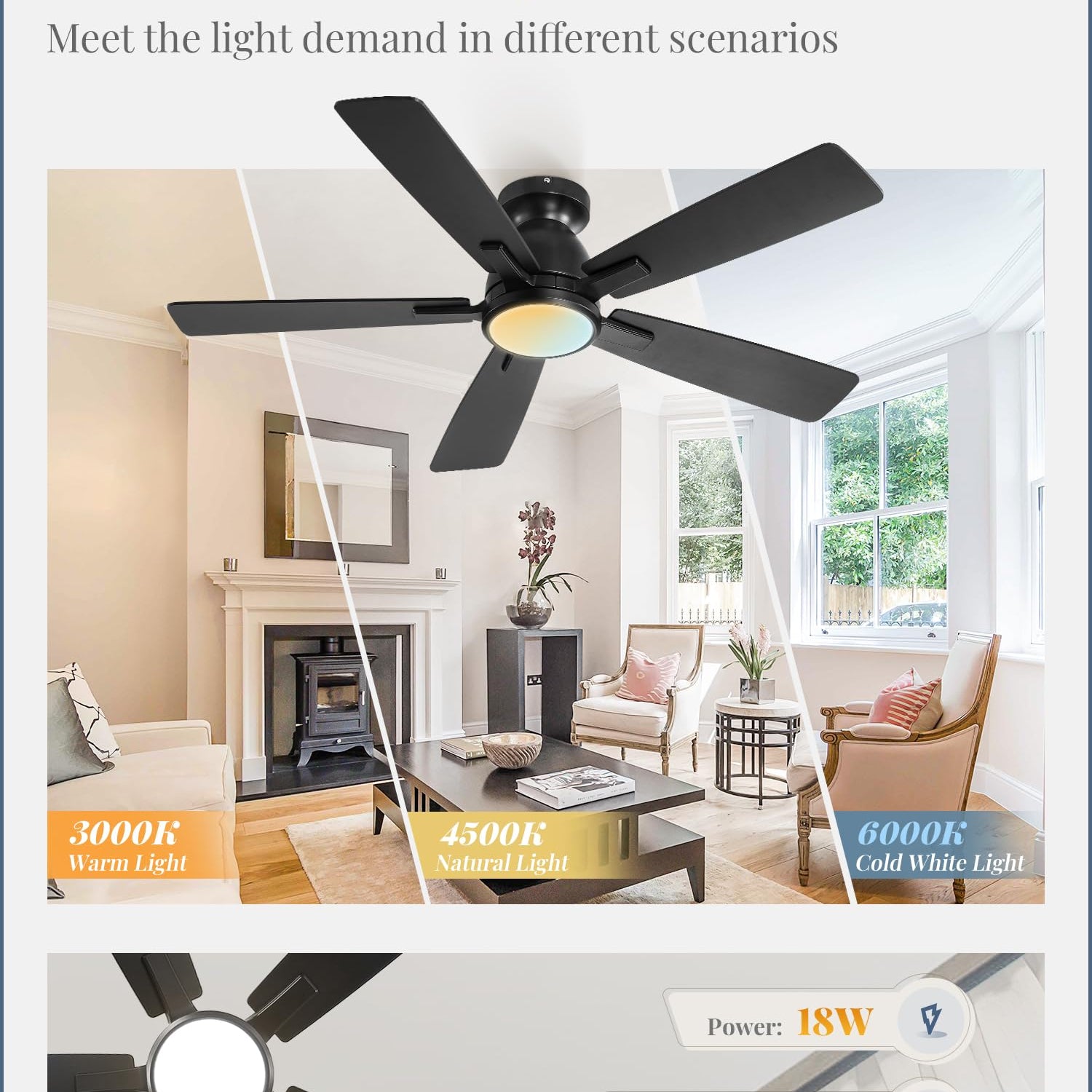 - 3CCT ADJUSTABLE BRIGHT LIGHT:This modern flush mount ceiling fans offers adjustable color temperature from 3000K to 6000K with modes for cool,natural and warm white.Low profile ceiling fan with light upgrade design improves energy efficiency,brighter and softer light for better eye comfort