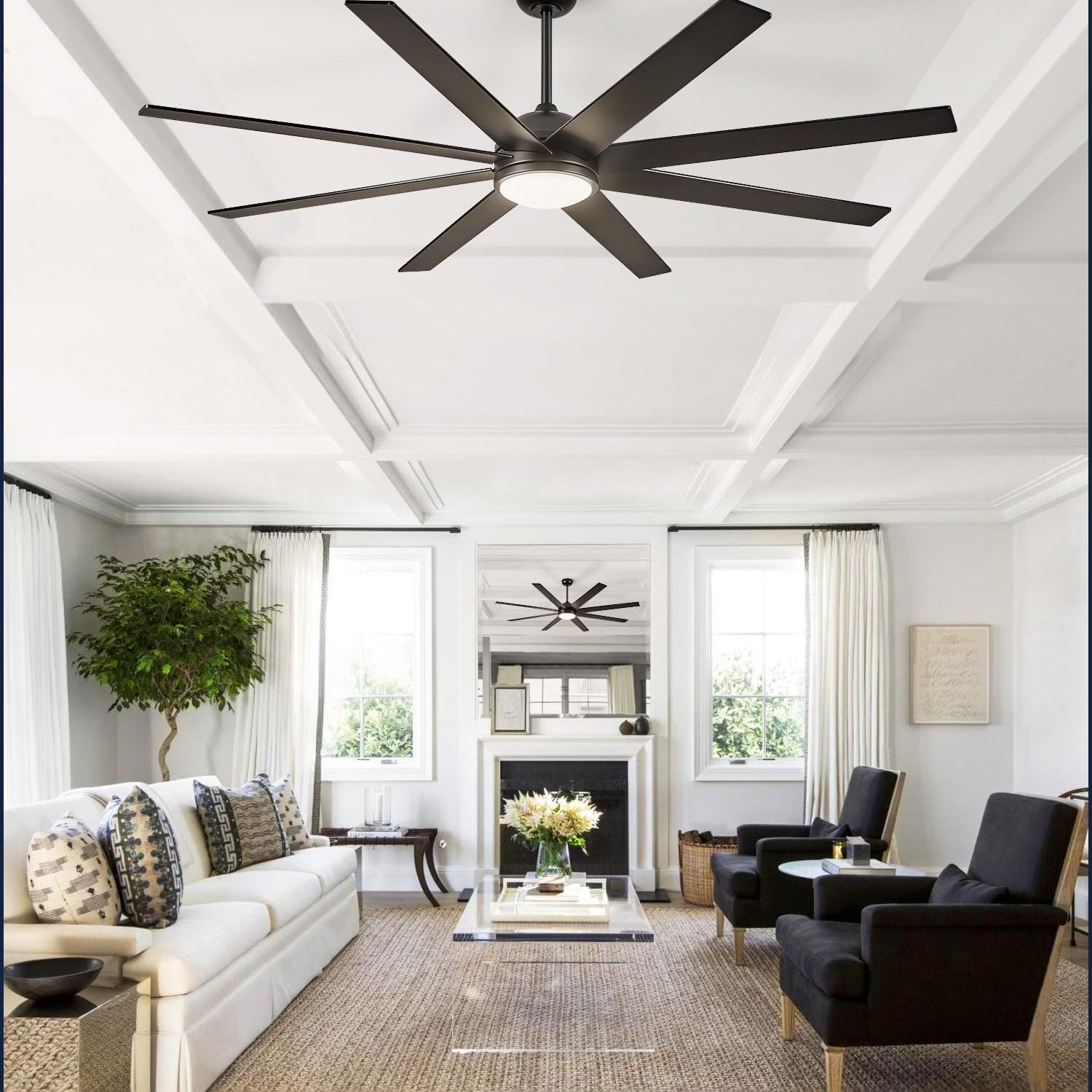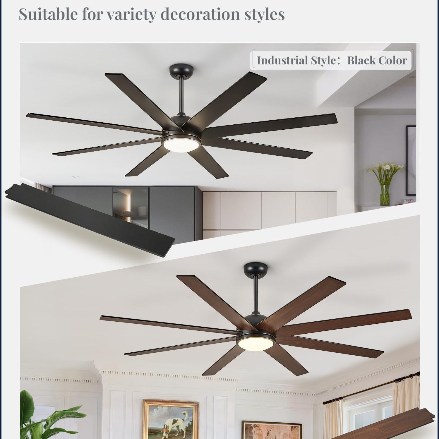 - 65 Inch Large Ceiling Fan: The living room ceiling fan has 2 colors on each blade - a classic black finish on one side and a warm wood grain tone on the other. Perfect for blending into modern or farmhouse style settings. With a 65-inch diameter, the modern ceiling fan is ideal for rooms up to 20ft.×20ft, suitable for living rooms, great rooms, covered patios and porches(Not to expose to rain directly)