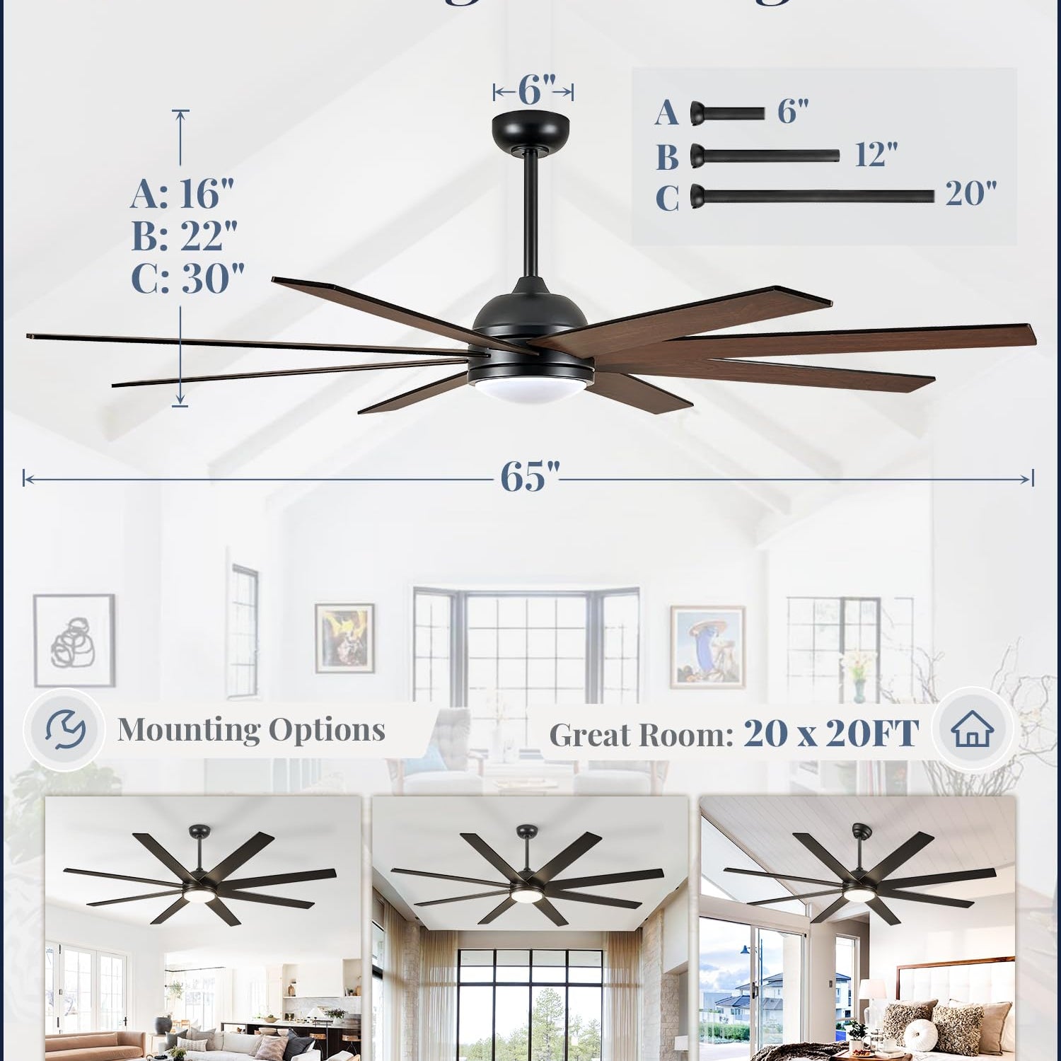 - Versatile Installation: The outdoor ceiling fans come with 6”, 12” and 20” downrods. The 6” downrod is perfect for ceilings up to 8 feet high, while 20” is suitable for 10 feet. You can also use the 20” downrod to enhance wind speed and air circulation. Moreover, the high ceiling fan can be angle-mounted (Max 15°)