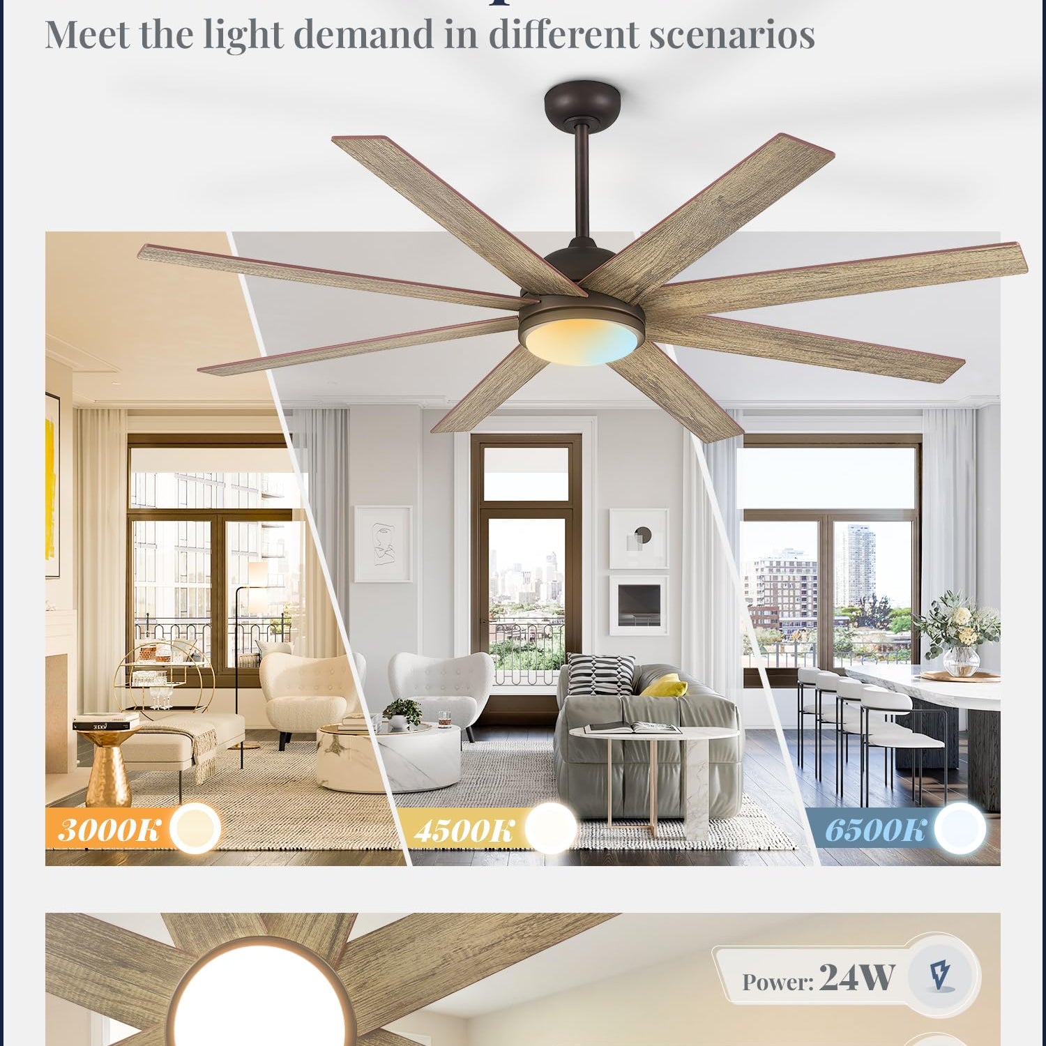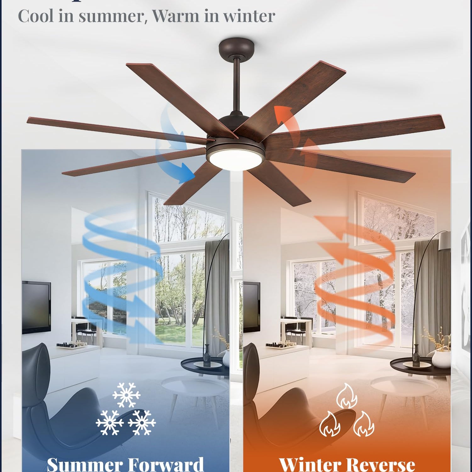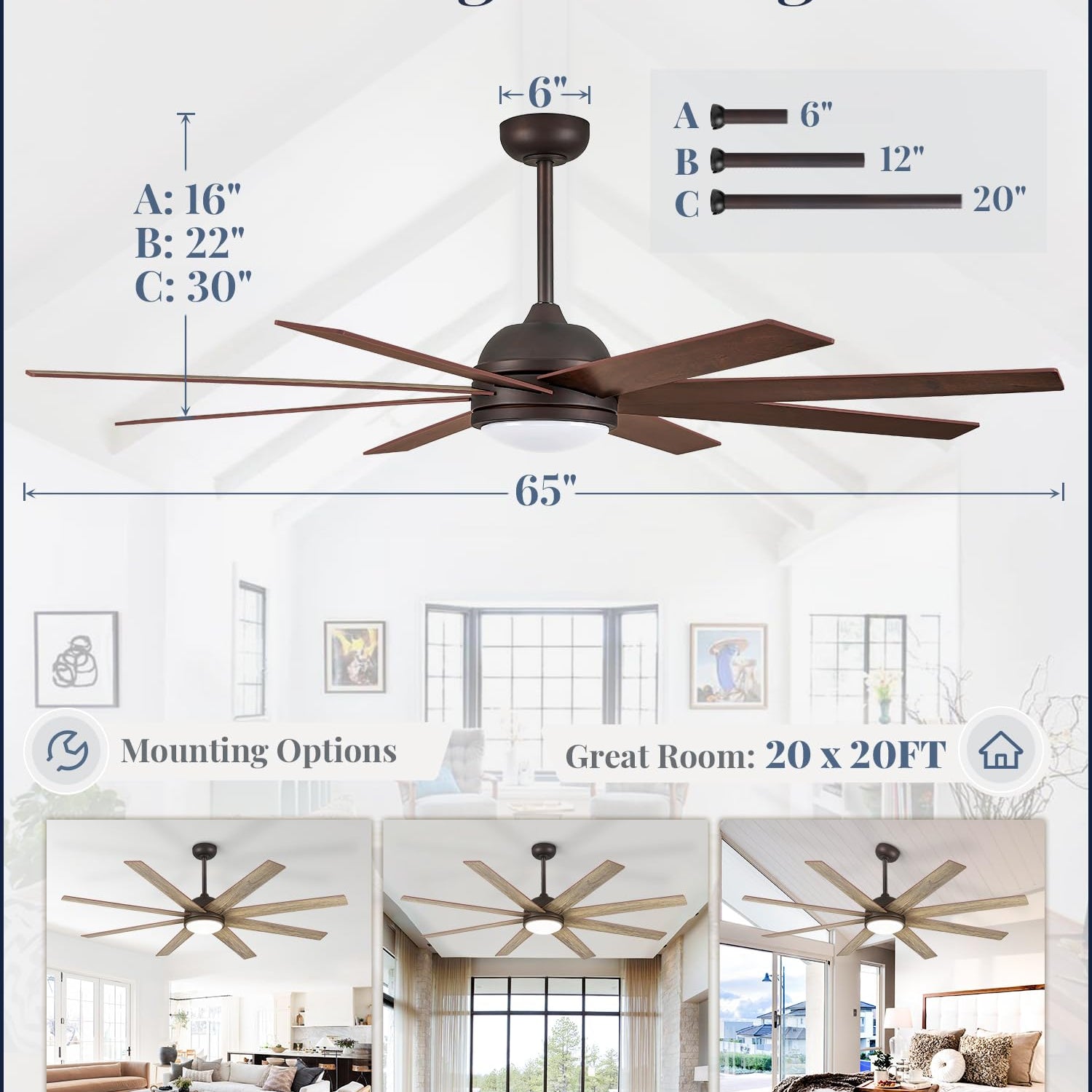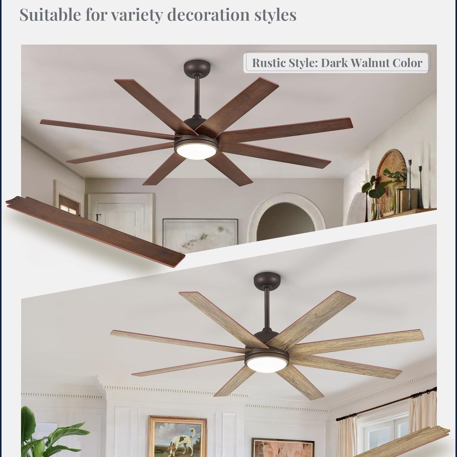 - 【65 Inch Large Ceiling Fan】The living room ceiling fan has 2 colors on each blade - a classic dark walnut finish on one side and a light wood tone on the other. Perfect for blending into modern or farmhouse style settings. With a 65-inch diameter, the modern ceiling fan is ideal for rooms up to 20ft.×20ft, suitable for living rooms, great rooms, covered patios and porches(Not to expose to rain directly).