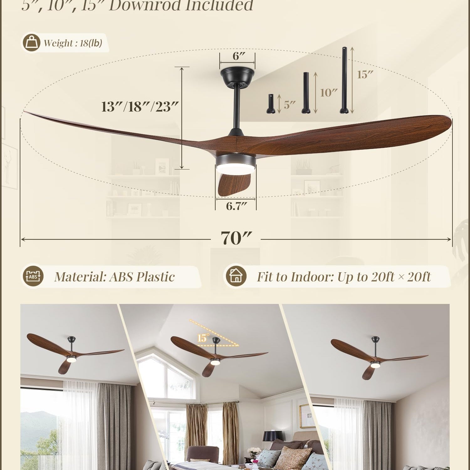 Fanbulous 70 inch Propeller Ceiling Fan With Light, Led Large Ceiling Fan with 6 Speeds, 3 ABS Wood Grain Blades Outdoor Ceiling Fans for Patios, Porch, Bedroom, 1/4/8H Timing- Deep Walnut