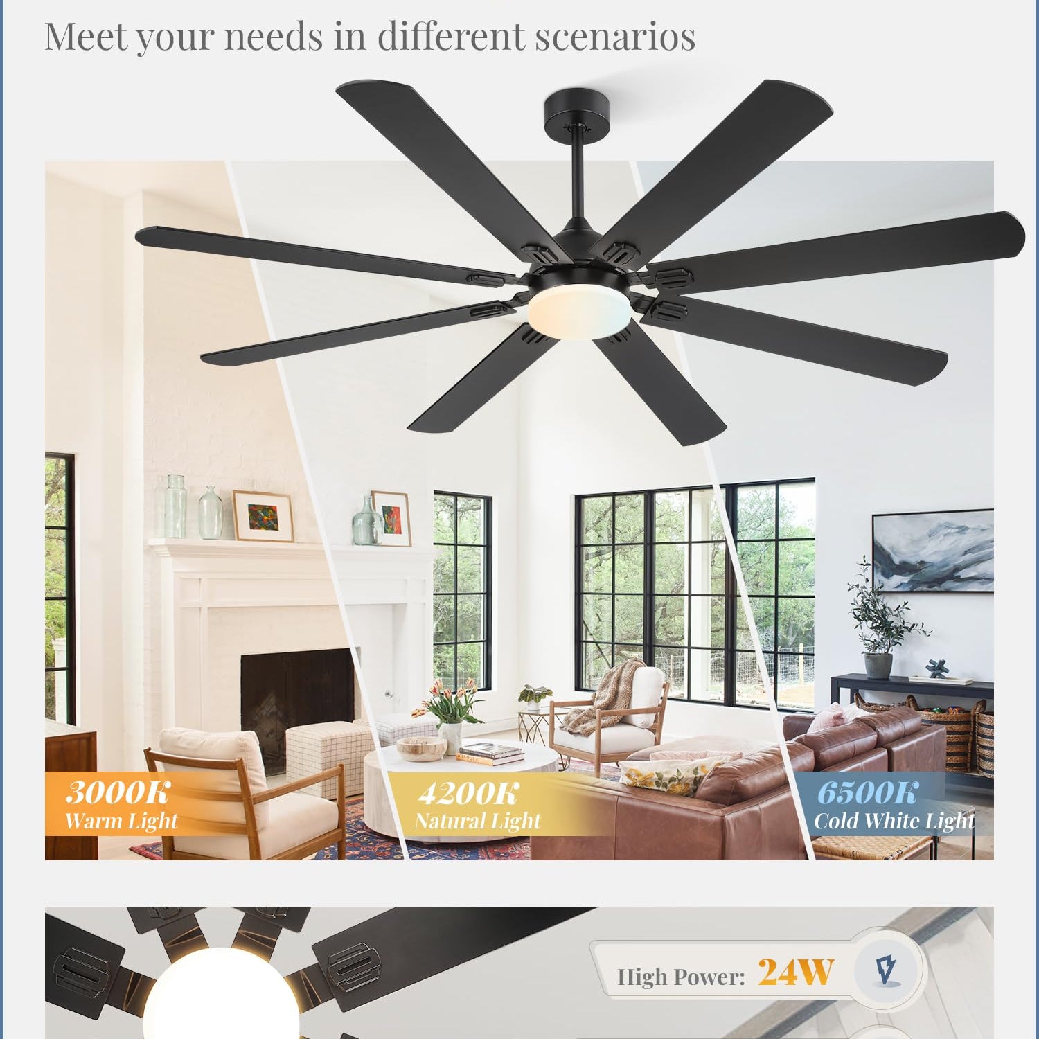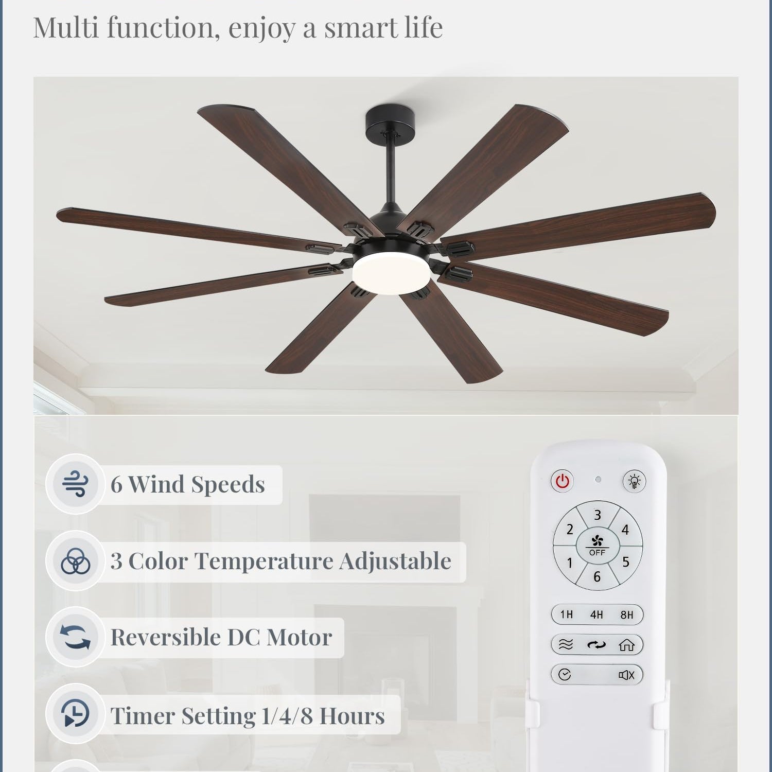 Fanbulous 72 Inch Ceiling Fans with Lights, Black Modern Ceiling Fan with Remote,Large Farmhouse Indoor & Outdoor Ceiling Fan with 8 Dual Finish Blades, Quiet DC Motor, Bright LED Light