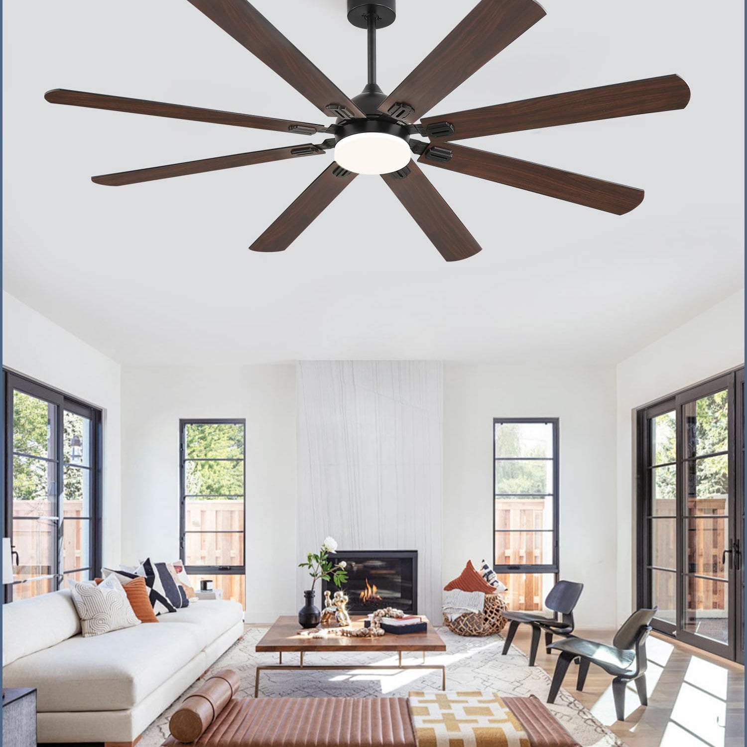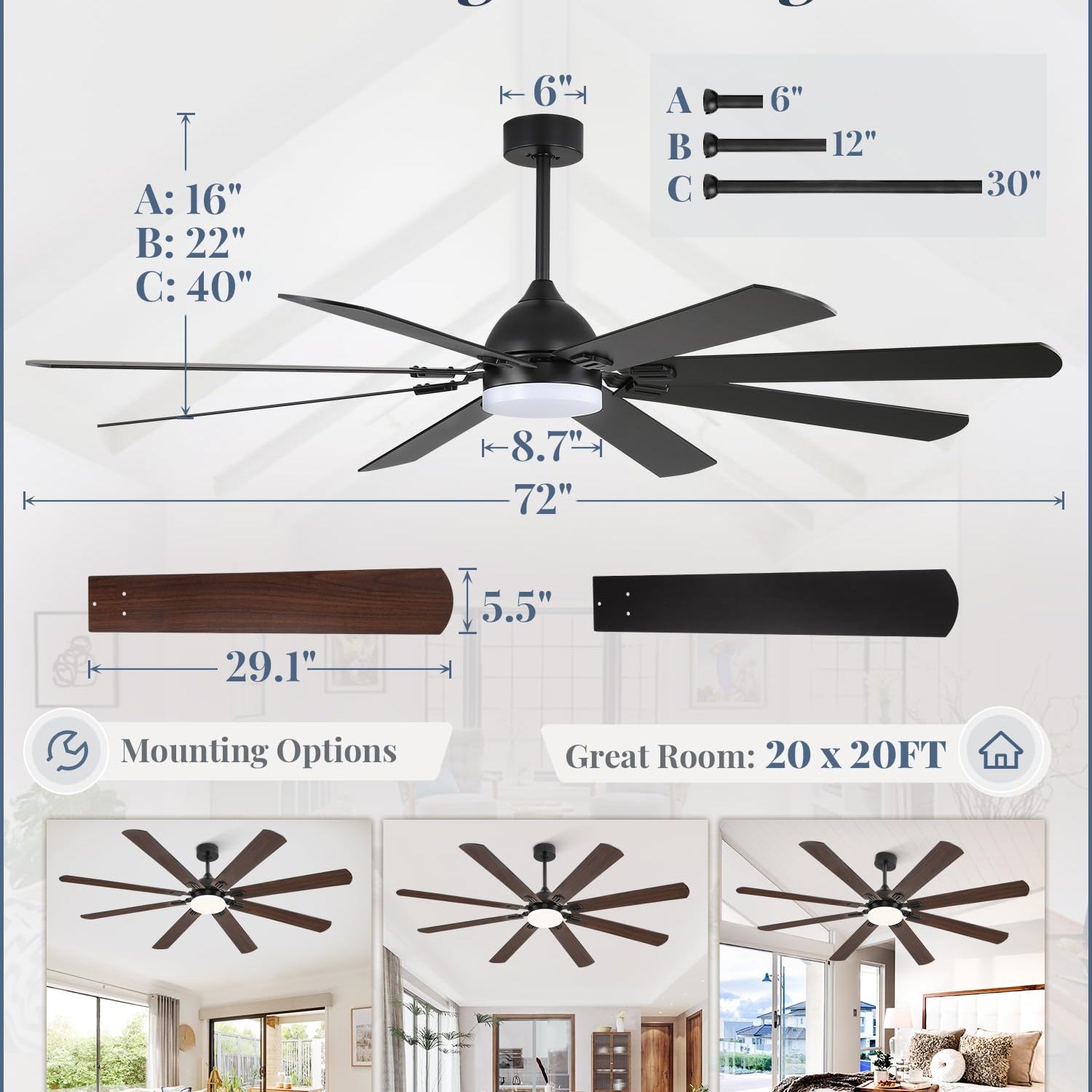 - 72 Inch Ceiling Fan with Remote: This 72 inch ceiling fan with light features a unique dual-sided design with black and walnut blades, blending modern simplicity with vintage farmhouse style to suit various decor styles. It has 8 blades to increase airflow and air delivery. The modern ceiling fan with light (including 6"/12"/30" downrods) can be installed on a 15° sloped ceiling, making it easy to install and clean.The indoor/outdoor ceiling fan suitable for multiple scenarios such as living room,lounge,bedroom, patio