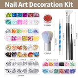 - Nail Art Decoration Kit: The kit includes 15pcs black nail art brushes, 5pcs nail dotting pen, 12 colors 5g fine glitter, 1 box 12 grids nail butterfly glitter, 1 box 12 grids nail heart glitter sequins, 1 box 12 grids nail foil flakes, 1 box clear nail rhinestones, 1 box colorful nail art rhinestones and 1pcs small nail dust brush.