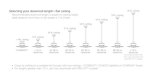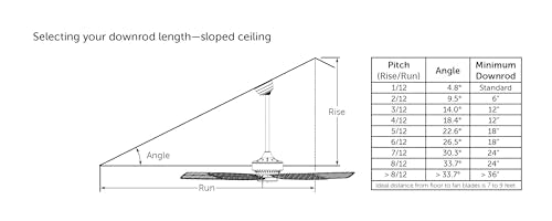 - Fan comes with an 1" diameter x 4.5" length threaded downrod. Optional downrods are available in lengths up to 72 inches. For installations requiring a longer downrod, a downrod coupler is available. Fan can be mounted on a sloped ceiling up to 19. Optional close-to-ceiling kit is available as well - sold separately. Optional sloped ceiling kits (SCK1-52) are available for up to 42.