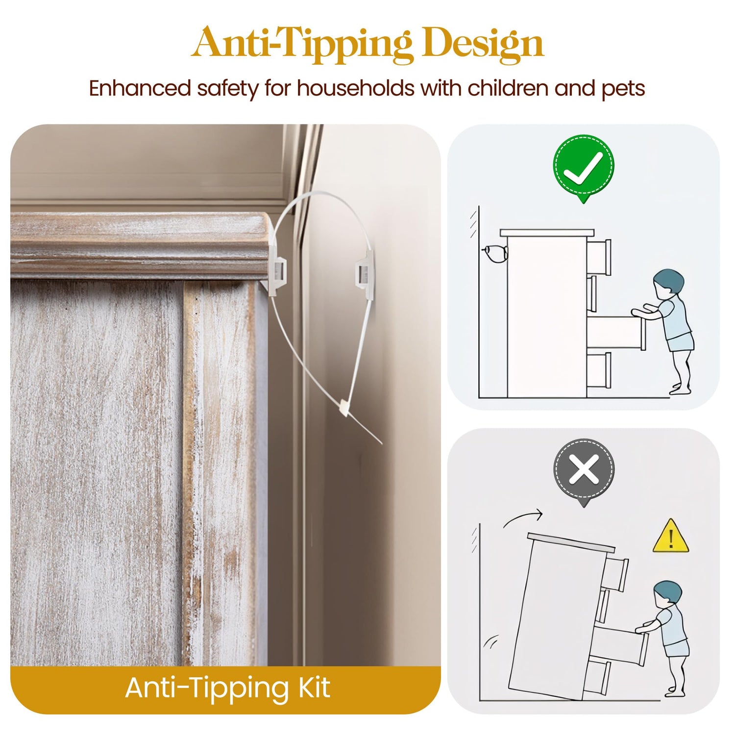 For your safety, we have specially designed an anti-tipping device to ensure the stability of the cabinet during use. The plastic feet on the bottom of the legs not only protect the floor, but also facilitate the movement and cleaning of furniture.