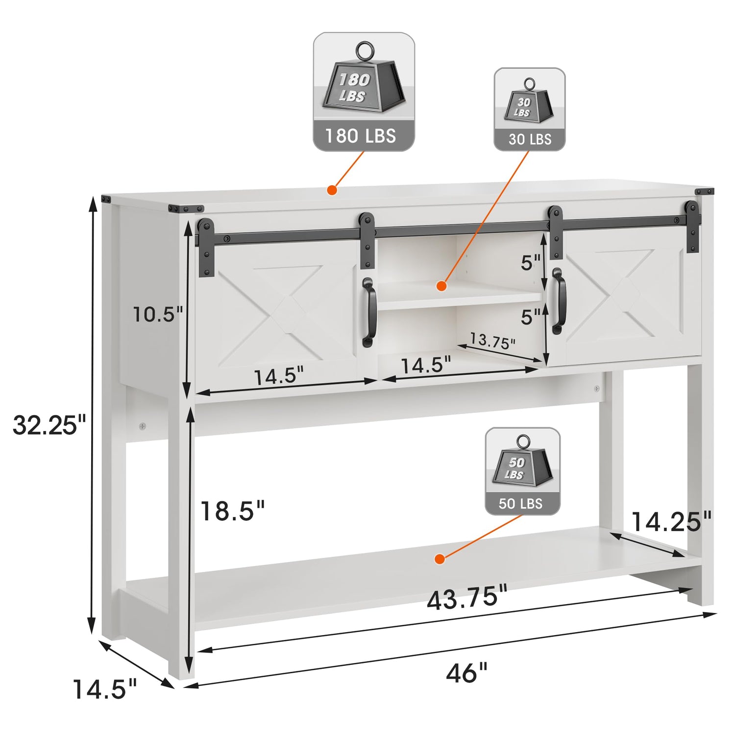 FansaFurn Console Table with Storage Shelf & Sliding Barn Door, Farmhouse Entryway Table with Storage, 46" Narrow Long Sofa, Behind Couch, Console Tables for Living Room (White)