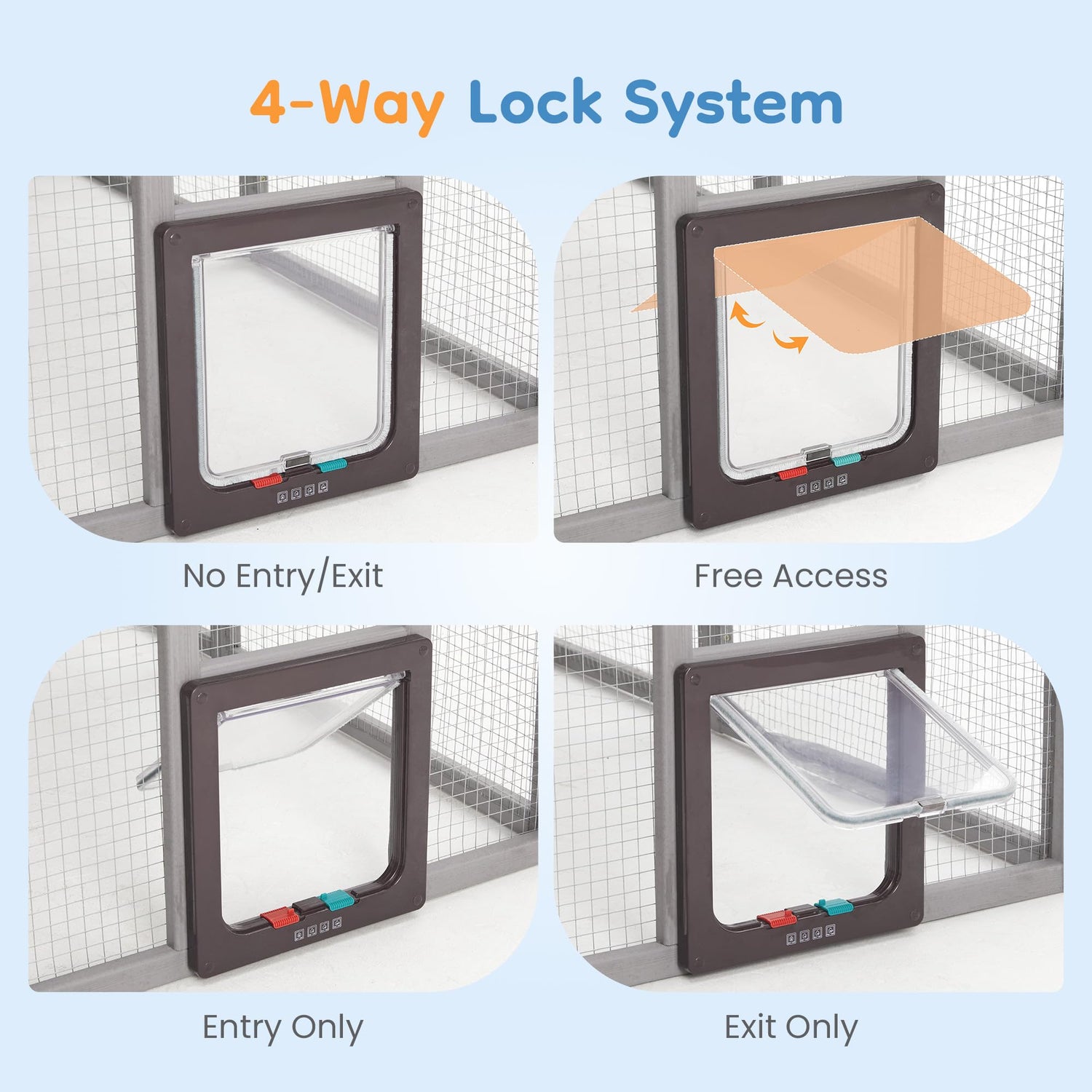 - Secure 4-Way Lock System - Take control of your cat’s outdoor adventures with four lock modes: No Entry/Exit, Free Access, Entry Only, and Exit Only. This feature ensures your cats stay safe from predators like raccoons and coyotes while allowing flexible indoor-outdoor access through a connected cat door or cat tunnel.