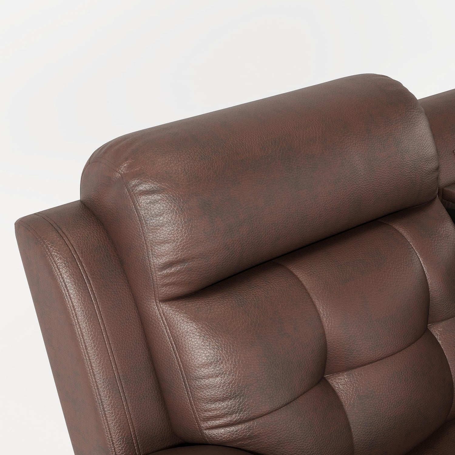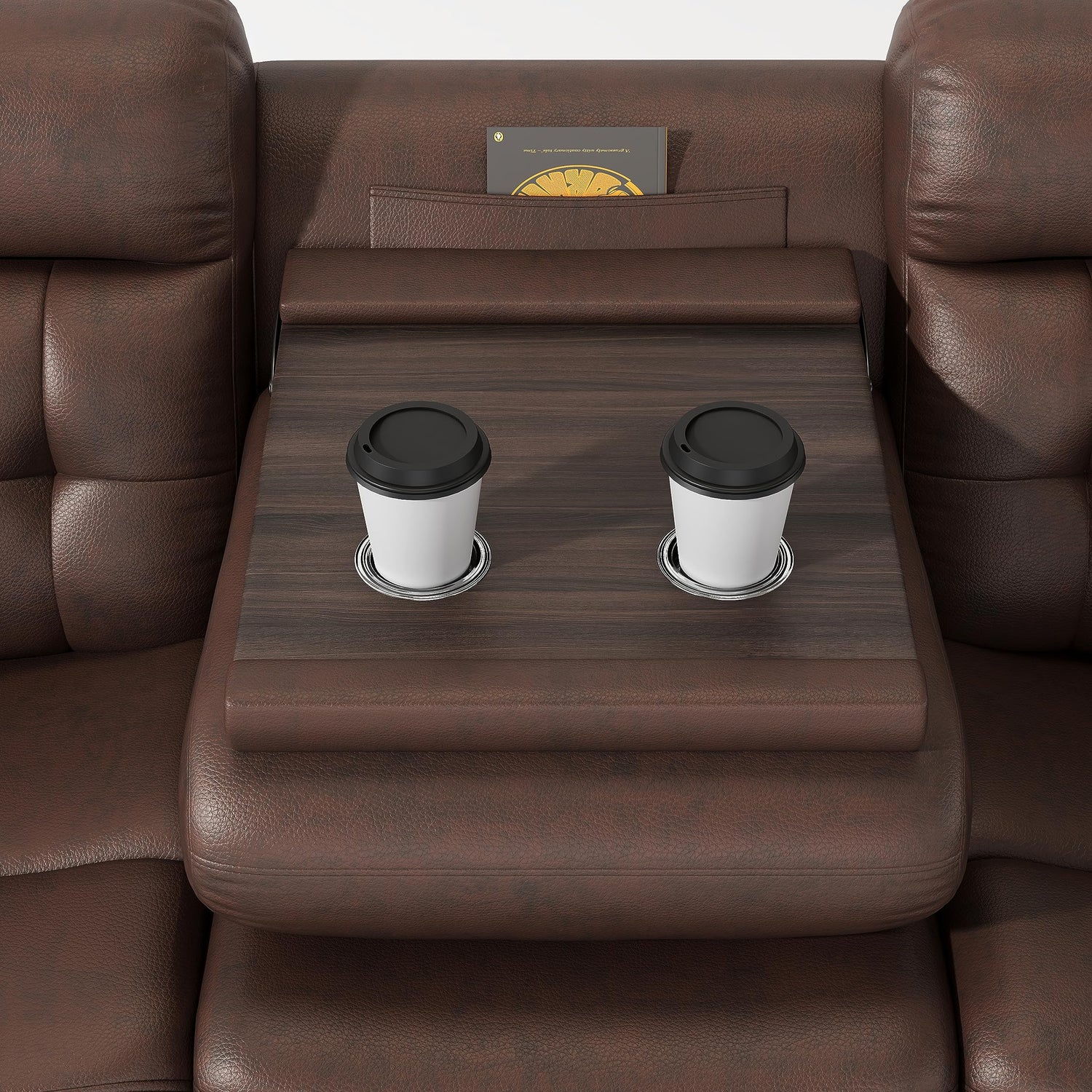 FANYE Leather 3 Seaters Manual Motion Sofa, Modern Home Theater TV Sofa&Couch w/Cupholders, Drop Down Table, 2 Recliner Chaises and Magazine Bag for Living Room Furniture Sets, 85", Brown