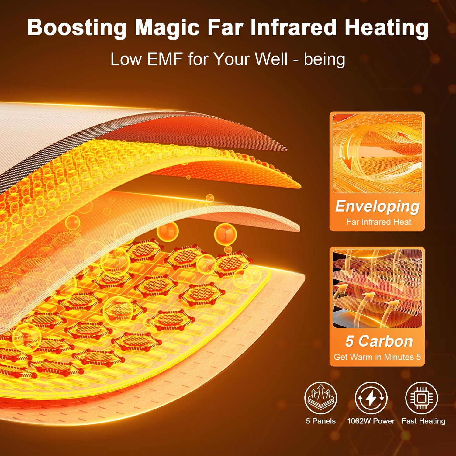 - Fast Heating Far Infrared Sauna Room: 5 highly efficient infrared carbon ultra-low electromagnetic field energy-efficient heating panels surround your body. 1062W ensures rapid heating and room temperature maintenance (64-149℉). The heat sink on the top ensures safe heating and air circulation, allowing you to ensure the oxygen content in the air during the sauna, giving you an oxygen bar experience of returning to nature