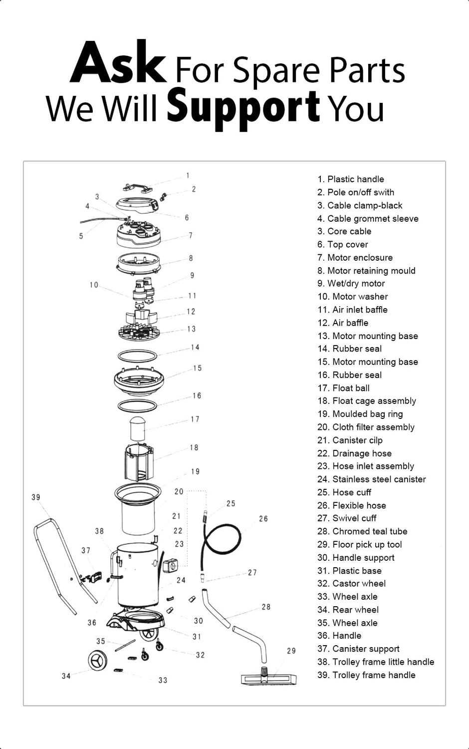 Large capacity tank with a flexible axle ,equipped With watershoot. Large base and racket with nice appearance and can be worked flexible and stable. Flexible trolley frame handle newly designed for JM772,convenient and practical. Stainless steel tanks,not easy to be rusty. powerful suction and long runtime. Anti-Cracking and heatproof machine,solid and durable,Also waterproof and static resistance. Multifunctional and standardized aceessories made of high quality material,long-lasting and durable. Attached a cloth filter assembly.