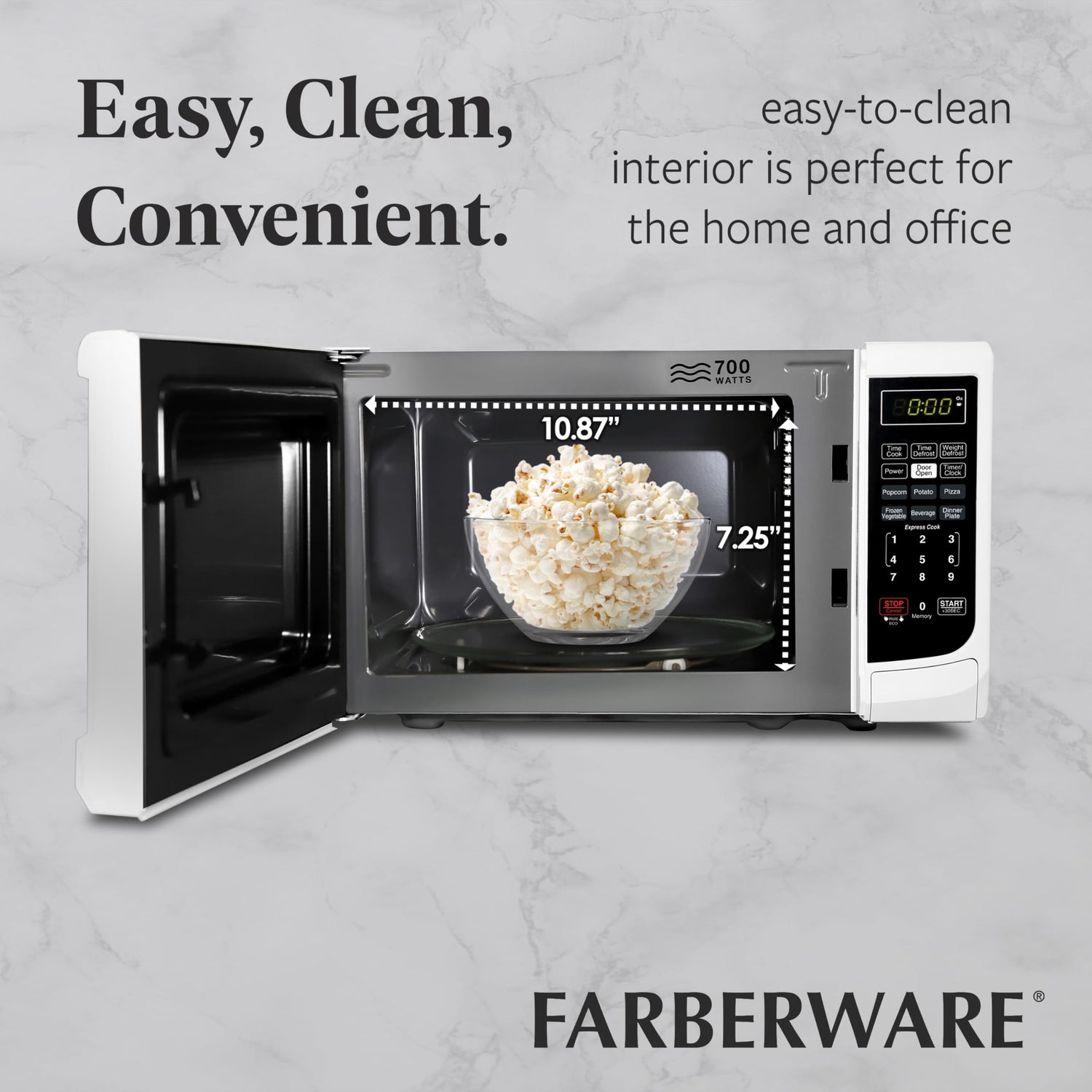 - PERFECT SIZE: Measuring 0.7 cu ft, this microwave is the ideal small-space solution that offers full-sized cooking in a compact space. It features an easy-to-clean interior and exterior and is perfect for the home or office.