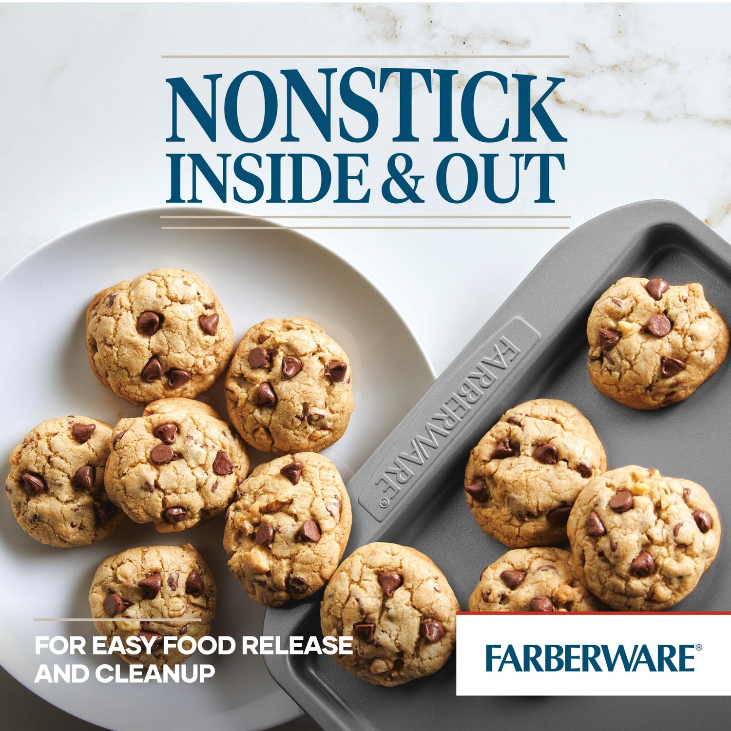 Details: Bake batch after batch of chocolate chip, lemon shortbread and oatmeal raisin cookies using the Farberware Nonstick Bakeware 11-Inch x 17-Inch Cookie Pan Set. With every piece of sturdy and dependable bakeware, Farberware upholds the tradition of reliability, value and performance provided to generations of home bakers for more than a century. These durable cookie pans feature heavy-duty steel construction that reliably resists warping and heats evenly to brown beautifully and help reduce hot spots that can burn baked goods. Nonstick inside and out - thoughtfully designed and responsibly made without PFAS, PFOA, lead, or cadmium* - delivers great food release and makes cleanup quick, even after baking a gooey batch of caramel fudge cookies. Oven safe to 450 degrees F, these nonstick cookie pans make an ideal addition to the cake, muffin and specialty baking pans in the Farberware Bakeware collection. Double up your cookie pan count with the Farberware Nonstick Bakeware 11-Inch x 17-Inch Cookie Pan Set. *Product design does not involve intentionally adding to the interior nonstick coating any of these substances which may otherwise be present in the environment.