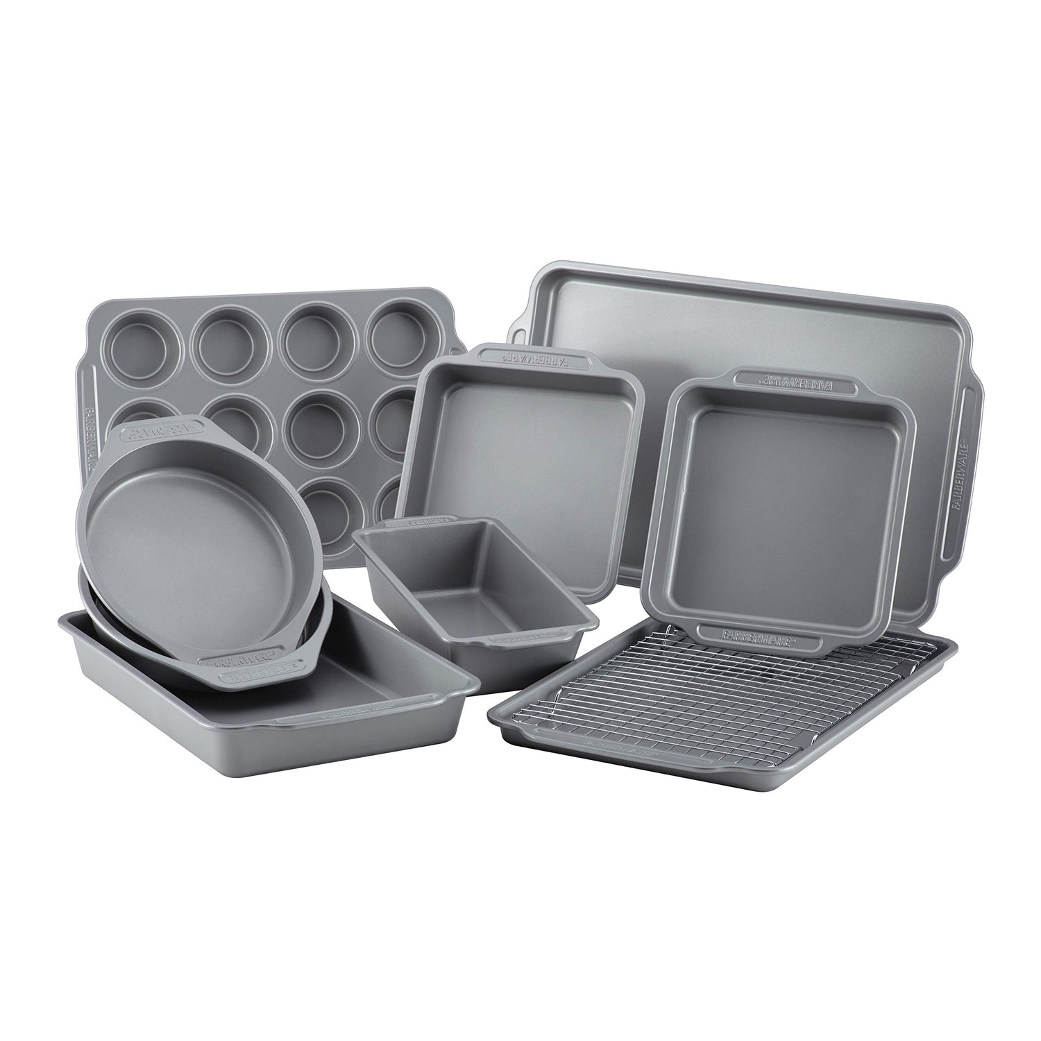 Farberware Nonstick Steel Bakeware Set with Cooling Rack, Baking Pan and Cookie Sheet Set with Nonstick Bread Pan and Cooling Grid, 10-Piece Set, Gray