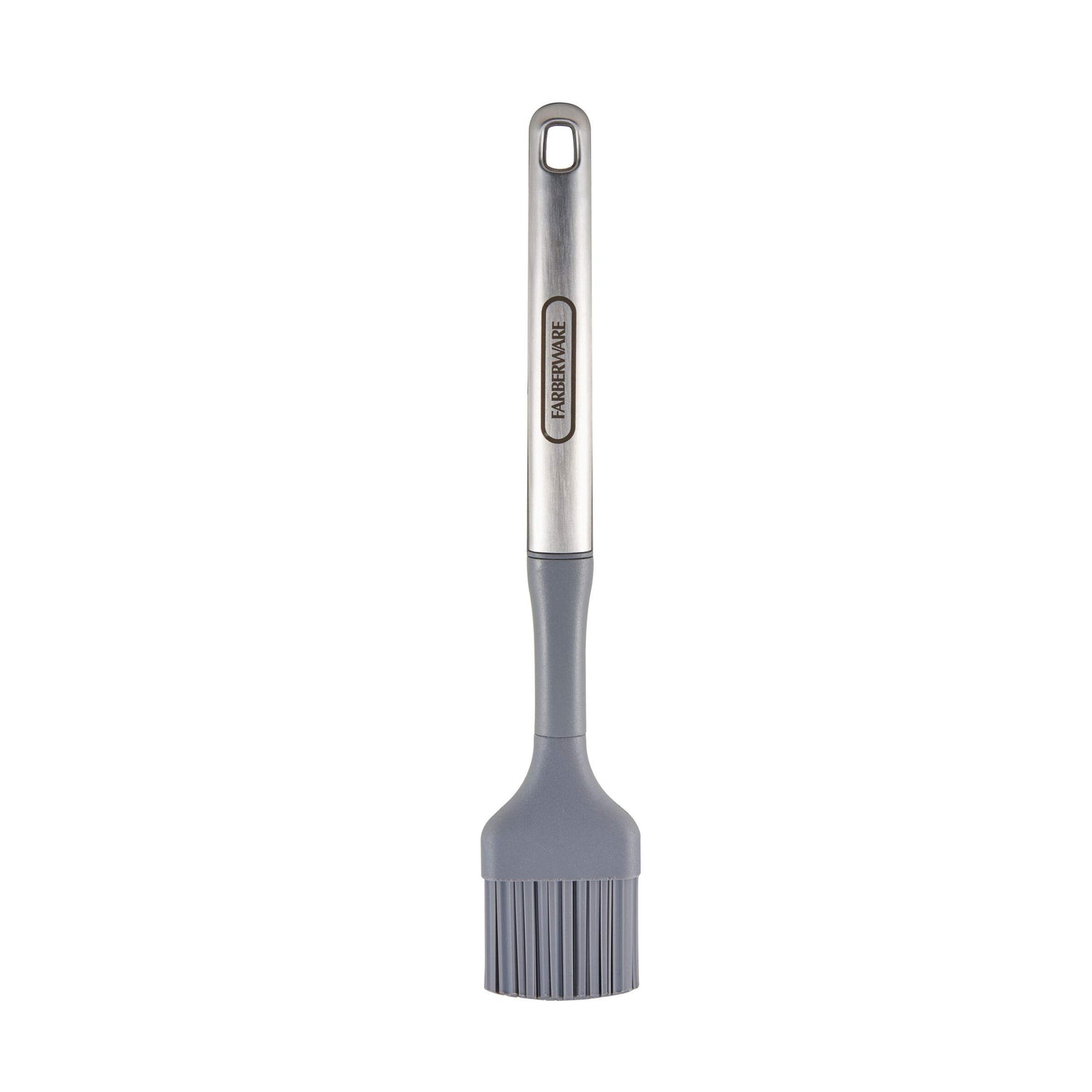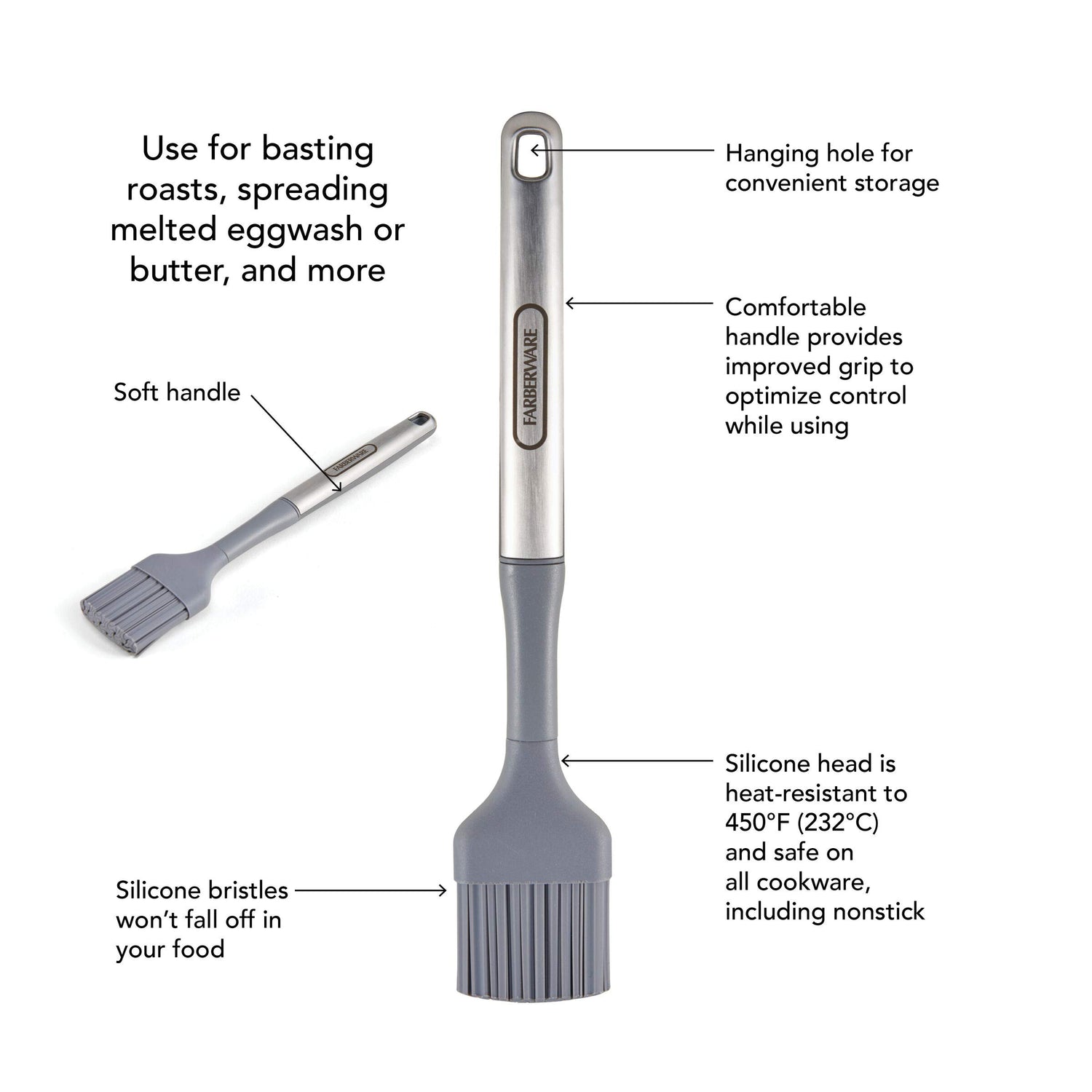 Details: This Farberware Professional Soft Grey Basting Brush is great for basting roasts or spreading melted butter onto pastries and breads. The silicone head is heat-resistant to 450 degrees F and safe for use on all cookware and bakeware, including nonstick. The ergonomically designed handle has a stainless steel top and soft bottom for a comfortable grip, with a hanging hole for convenient storage on a utensil rack. Measures 11 inches long. Dishwasher safe.