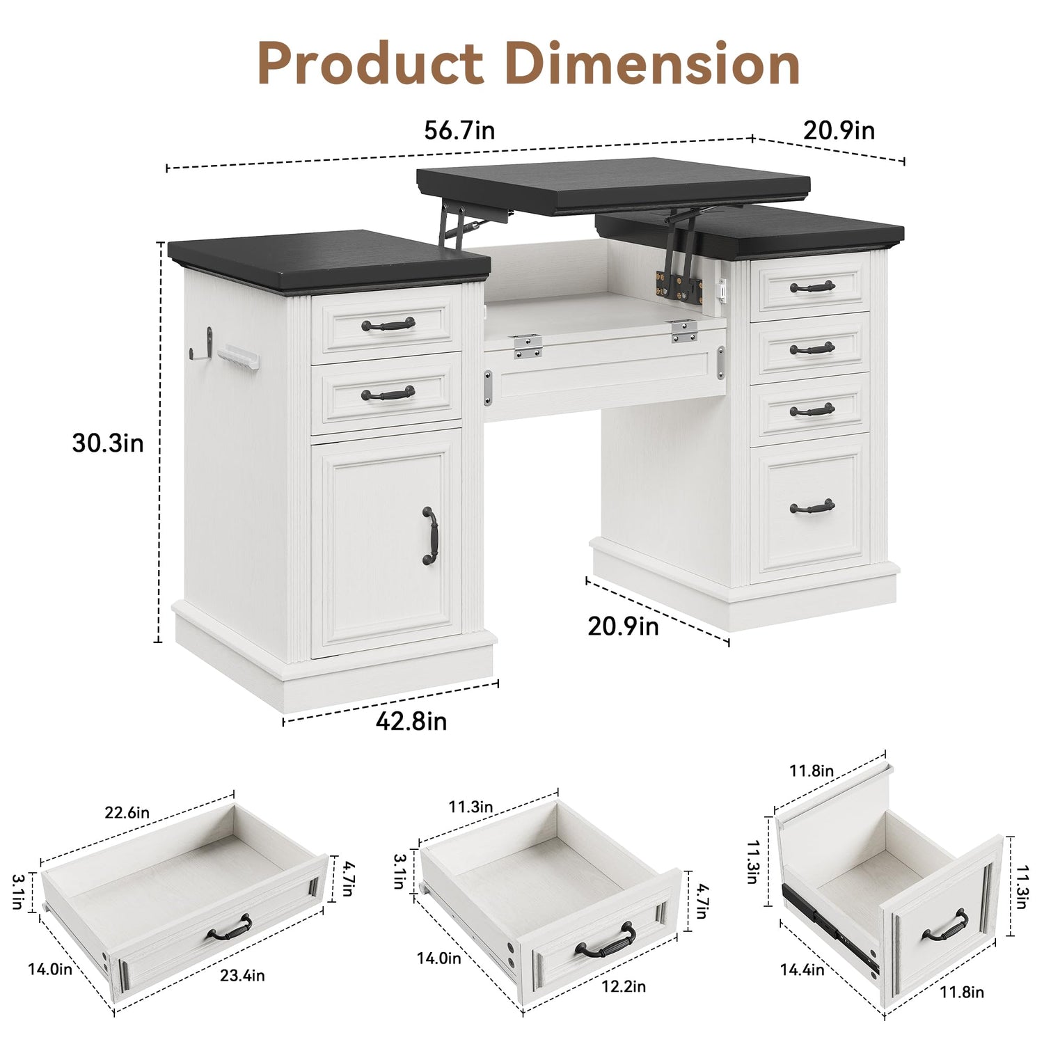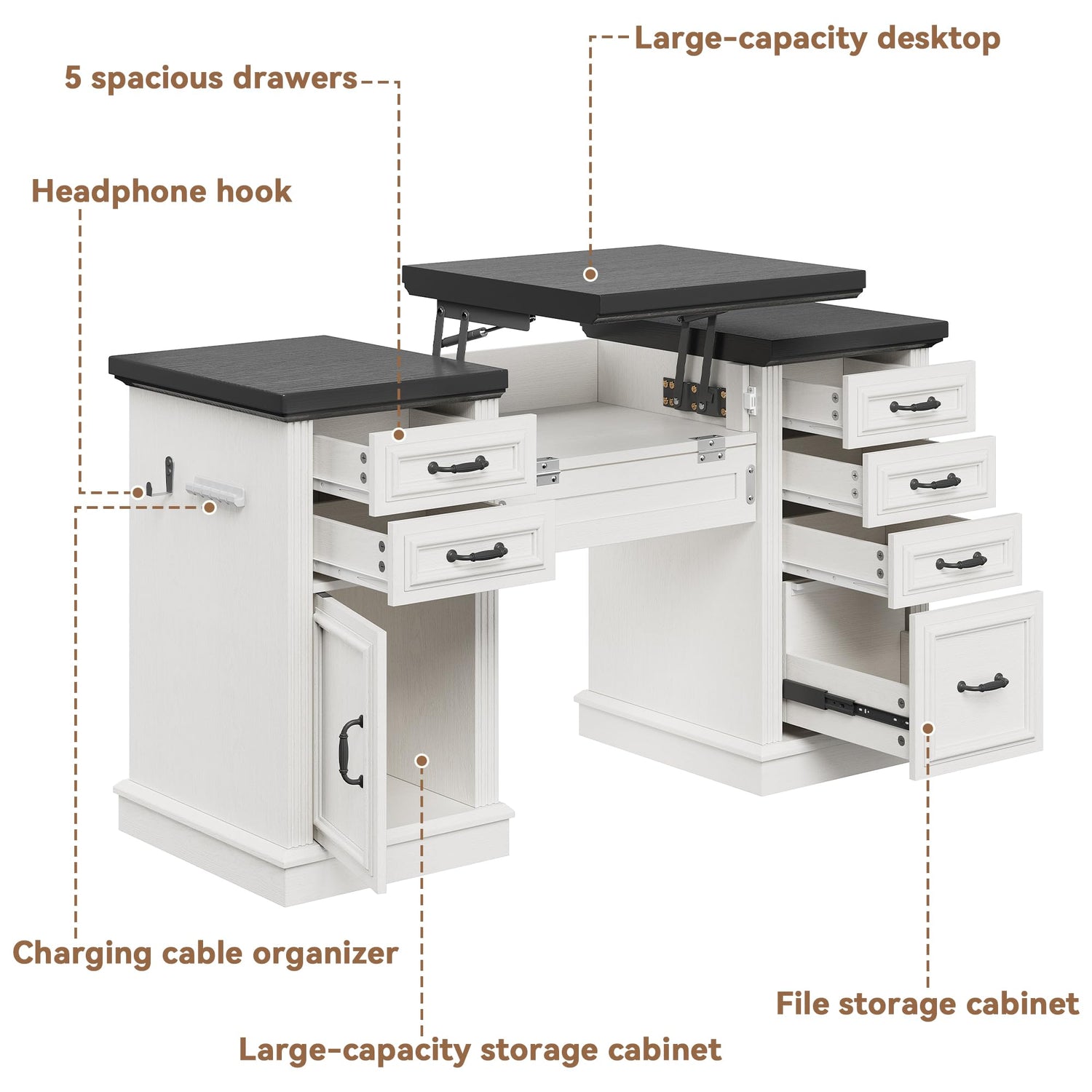 Farmhouse 57" Lift Desktop Executive Desk with 6 Drawers and Charging Station, Wood Home Office Computer Desk with File Cabinet Storage, Keyboard Tray,Headphone hook for Work,Study, Antique White