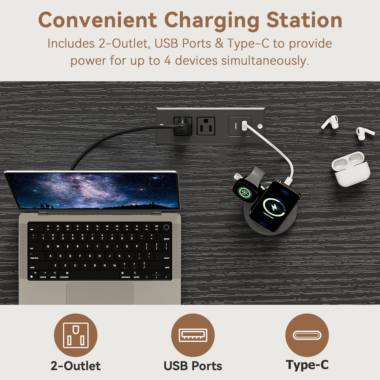 - CONVENIENT BUILT-IN CHARGING STATION: Work easier without lifting a finger! This home office desk built-in charging station is equipped with USB ports, Type-C ports, and two AC outlets, which integrates seamlessly into the desktop design and bring unparalleled convenience. Easily connect and manage cables of computers, desk lamps, chargers, and other devices, and the included cable organizer can reduce cable clutter and improve functionality