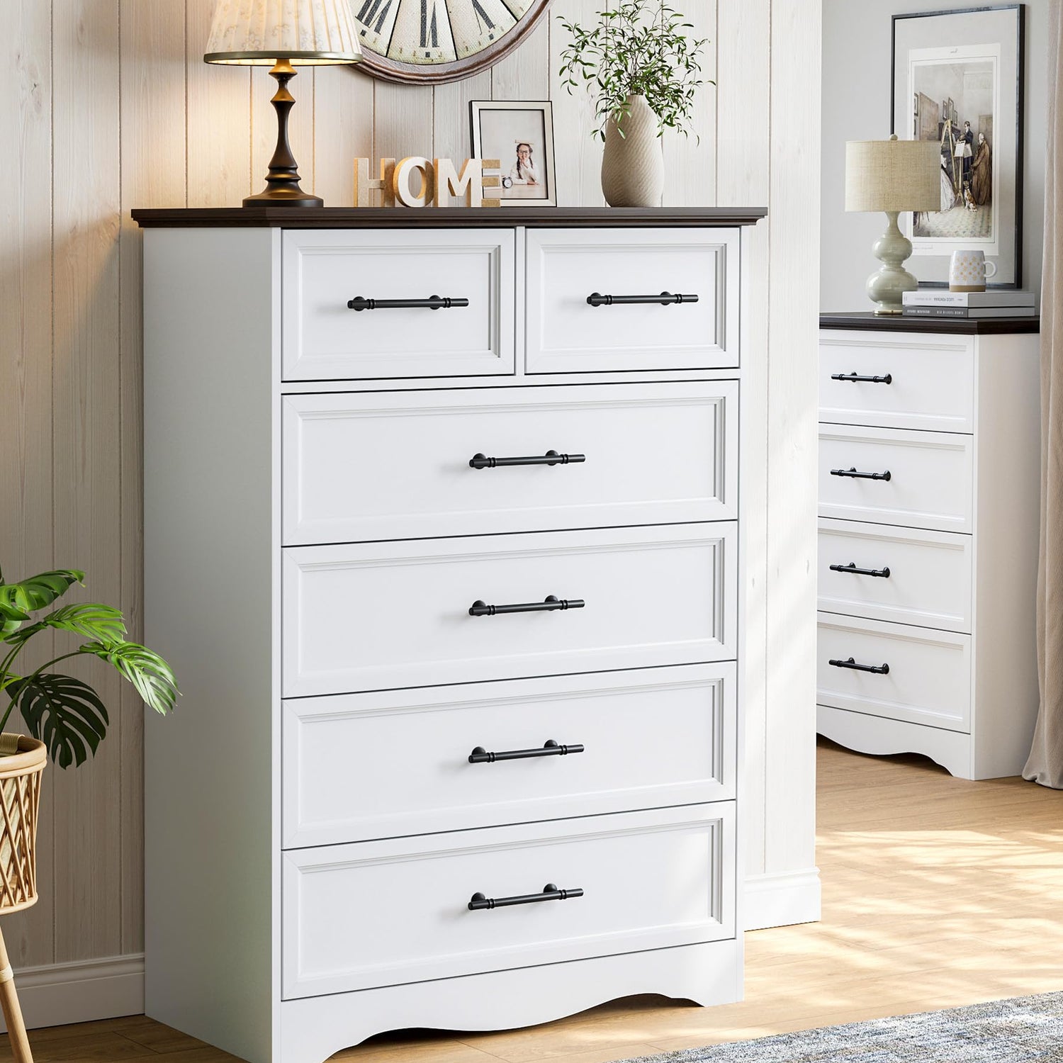 - 【Dimensions】The 6 drawers dresser dimension: 15.7"D x 31.08"W x 44.3"H. Whether in a modern loft or farmhouse setting, this chest of drawers fits right in. It presents a sophisticated interpretation of rustic charm, featuring subtle replicated wood grain with a natural finish for an authentic feel.