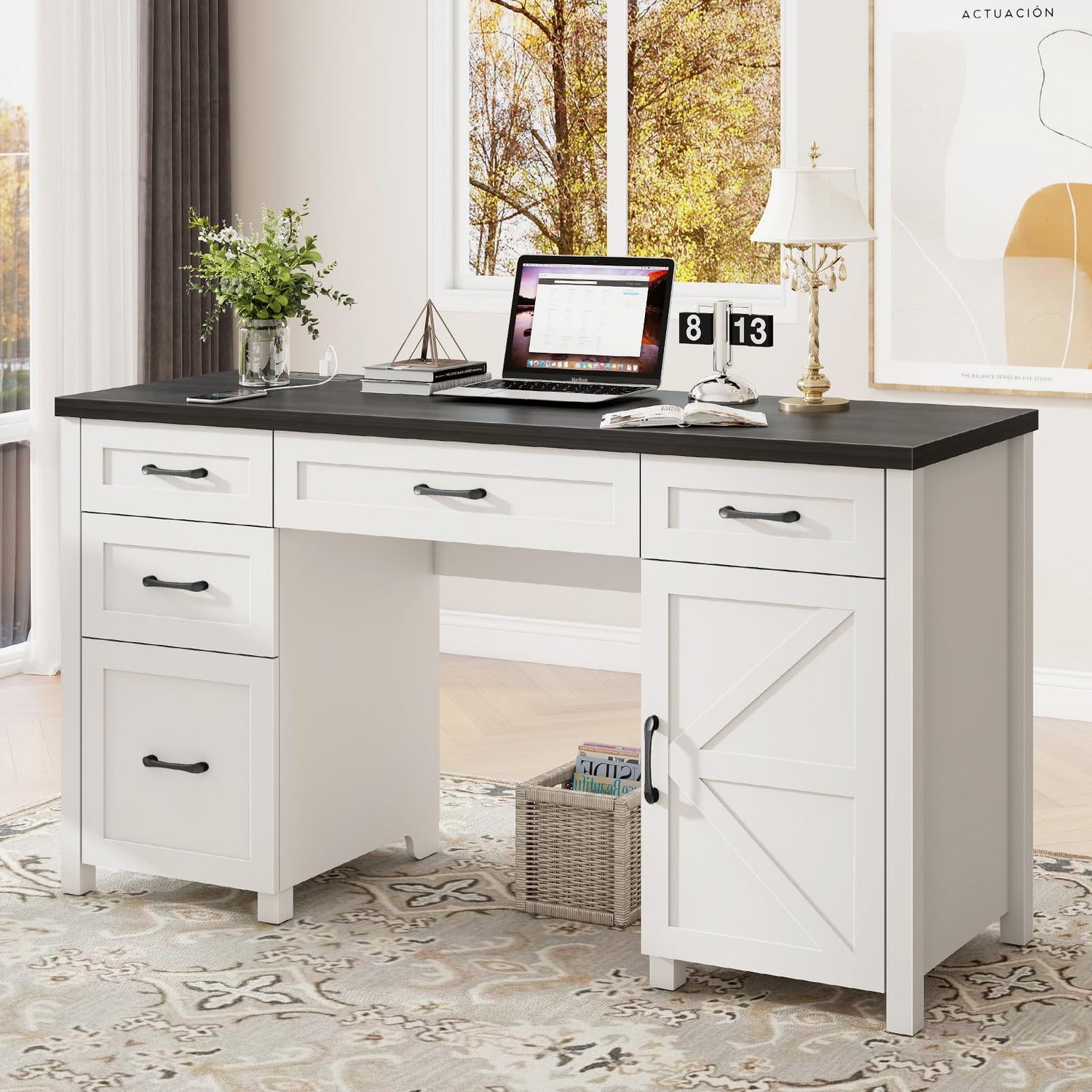 Farmhouse 61'' Executive Desk with 5 Drawers, Rustic Office Desk Computer Desk with Charging Station, File Drawers and Storage Cabinet, Wood Workstation for Home Office and Study.(Black Top)