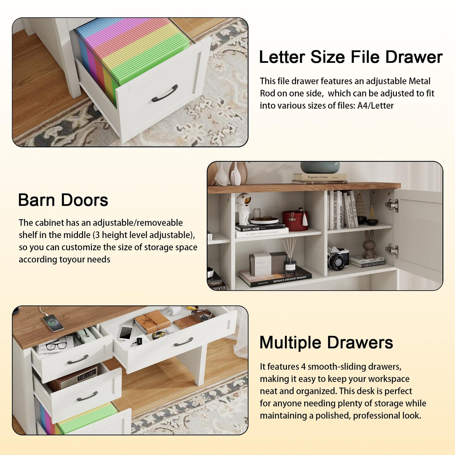 Farmhouse 67" H Executive Desk with Hutch,Office Desk with 4 Drawers and LED Light, Computer Desk with Storage Cabinet & File Drawers and Charging Station, Wood Workstation for Home Office and Study