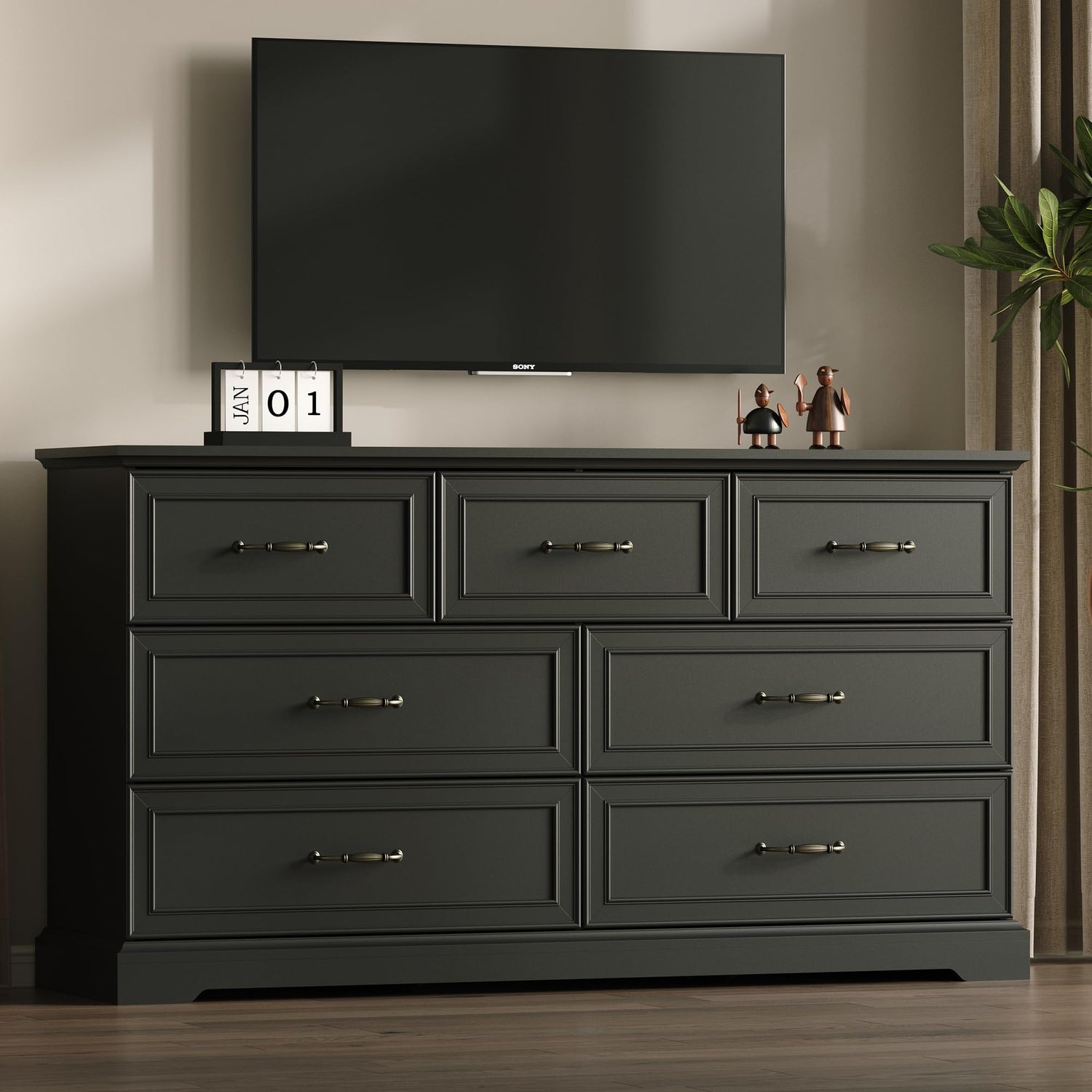 - 【Satisfactory Storage Capacity】The modern dresser features 7 large drawers, each measuring 27.68"W × 13.78"D/ 18.38"W × 13.78"D, providing plenty space to organize clothes, bedding, cosmetics, or jewelry, helping you maintain a tidy space. The spacious tabletop can serve as a dresser TV stand or a stylish canvas to showcase photo frames, plants or mirrors