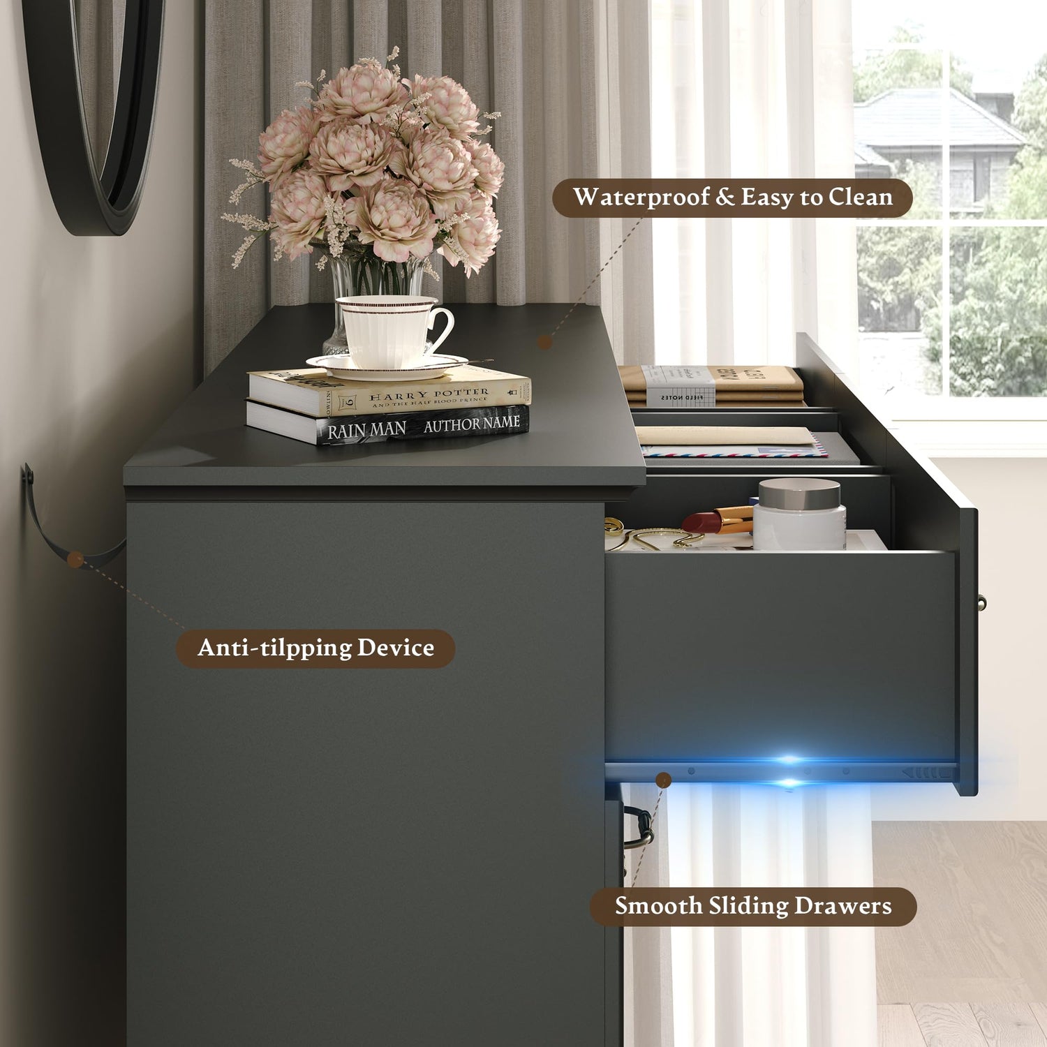 - 【Solid Material & Study Construction】The bedroom dresser is constructed from optimal MDF, P2 engineered wood, coated metal handle and employ skilled craftsmanship to guarantee durability, ensure long-term use. Each drawer holds up to 40 lbs/20 lbs and the thickened tabletop can support up to 180 lbs. For easy cleaning, wipe with a damp cloth and air-dry