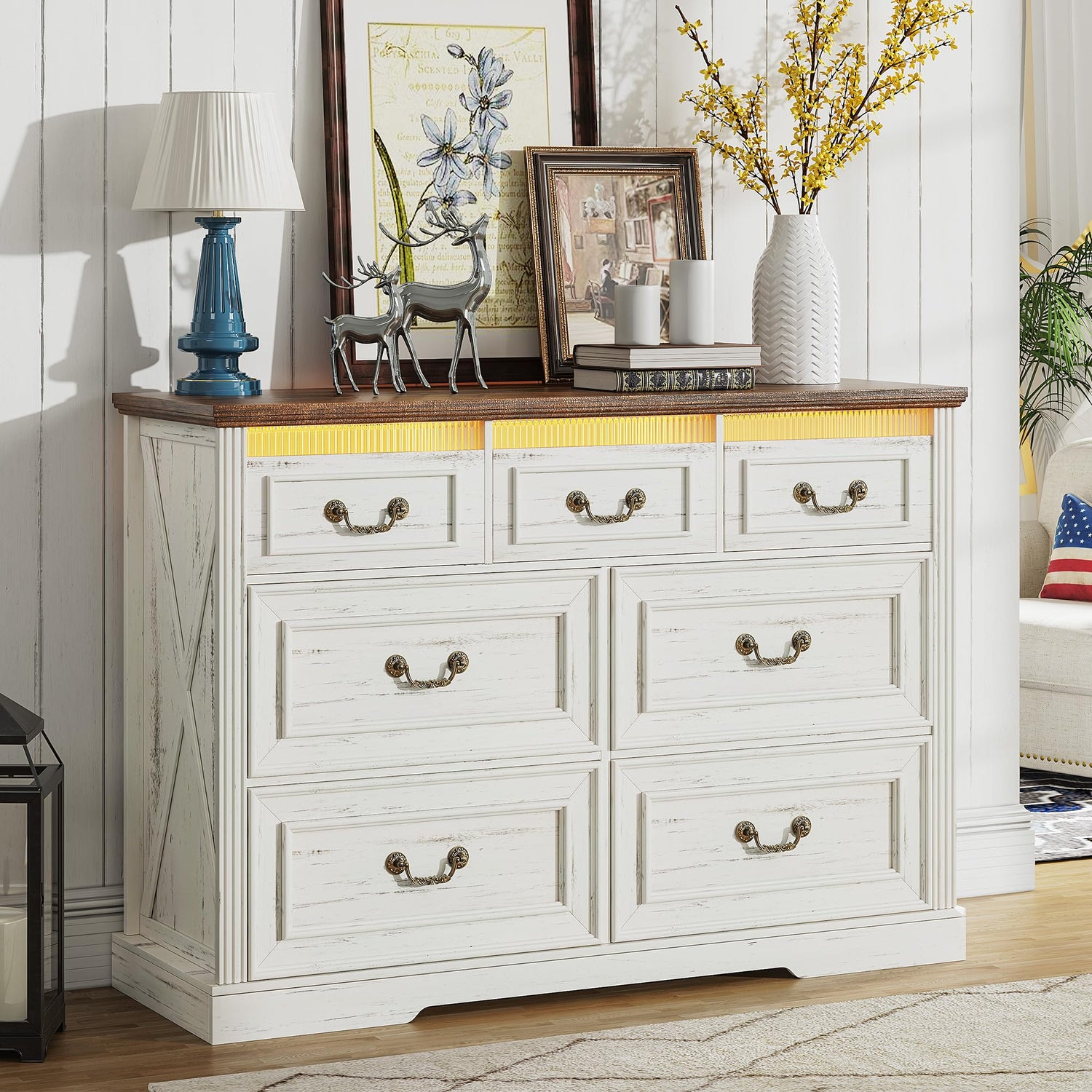 Farmhouse 7 Drawers Dresser for Bedroom, Large Chest of Drawers with Hidden Storage, Tall Dresser with LED Lights, Wood Dressers Organizer for Living Room, Closet, Hallway, Antique White