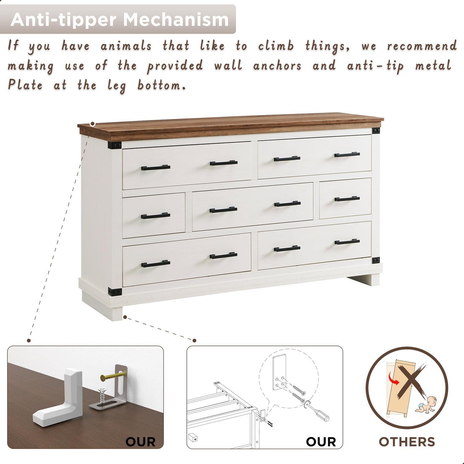 - Stable and Sturdy: Our chest of drawers for bedroom crafted from thick, high-density engineered wood. The 1.77" thick crown moulding dresser top can load up to 150 lbs. 4.13" unique substantial base ensure excellent stability and large weight capacity for this storage dresser. Wide dresser equipped with wall anchors to eliminating tipping concerns, protecting you and your family's safety. The extra anti-tip metal plates for the dresser bottom can be installed or not according to your preference.