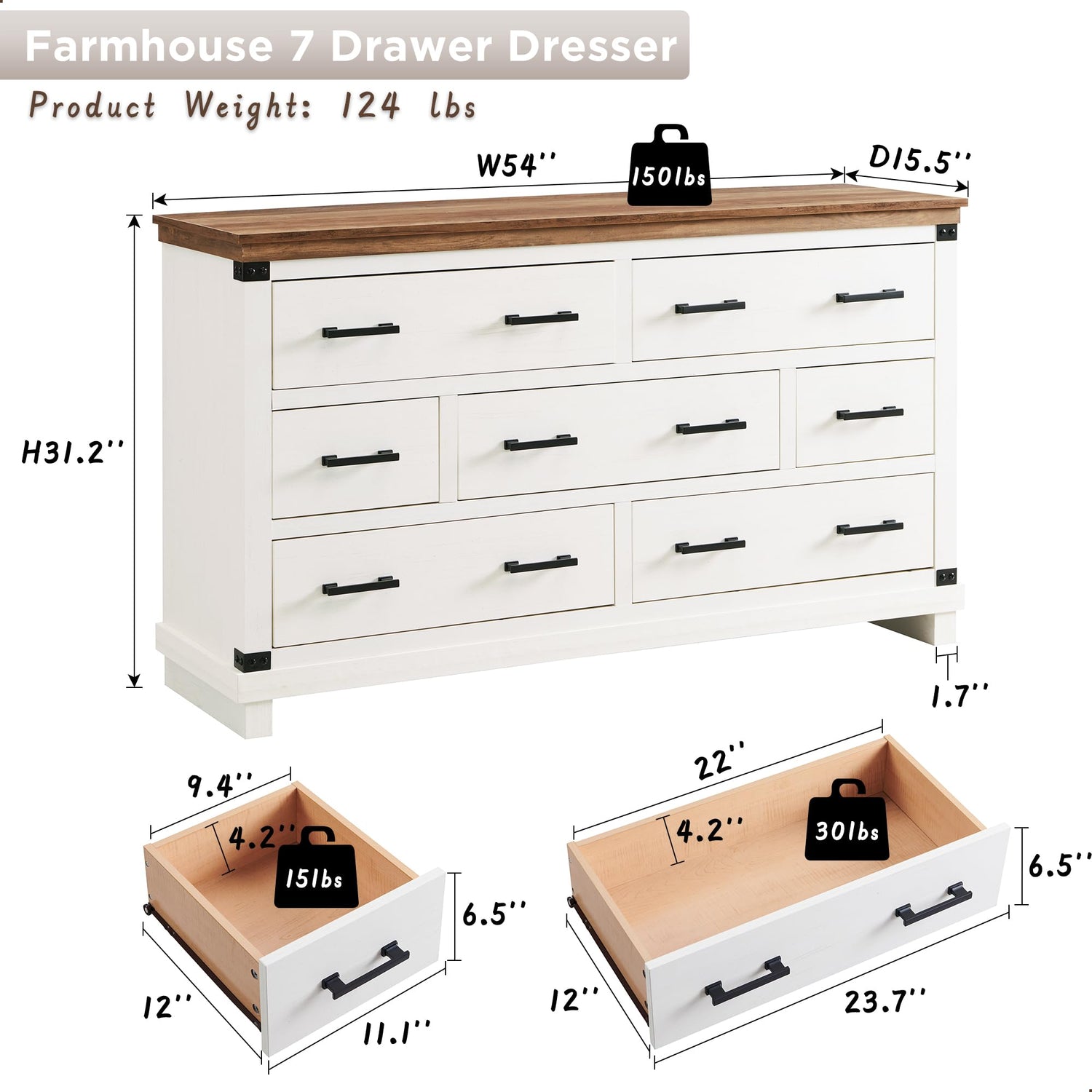 - Multi-Storage Purpose: Measuring L54"*W15.5"*H31.25". This long dressers for bedroom boasts an immense storage capacity - 7 smooth-glide drawers, each measuring: Large L23.77"*W12"*H6.53", Small L11.14"*W12"*H6.53". A true multi-purpose marvel, it adapts seamlessly to diverse needs. Be it your bedroom closet dresser storage for clothes, bedding, cosmetics, jewelry, and more, or your living room items storage cabinet, this wooden drawer chest dresser emerges as the quintessential choice.