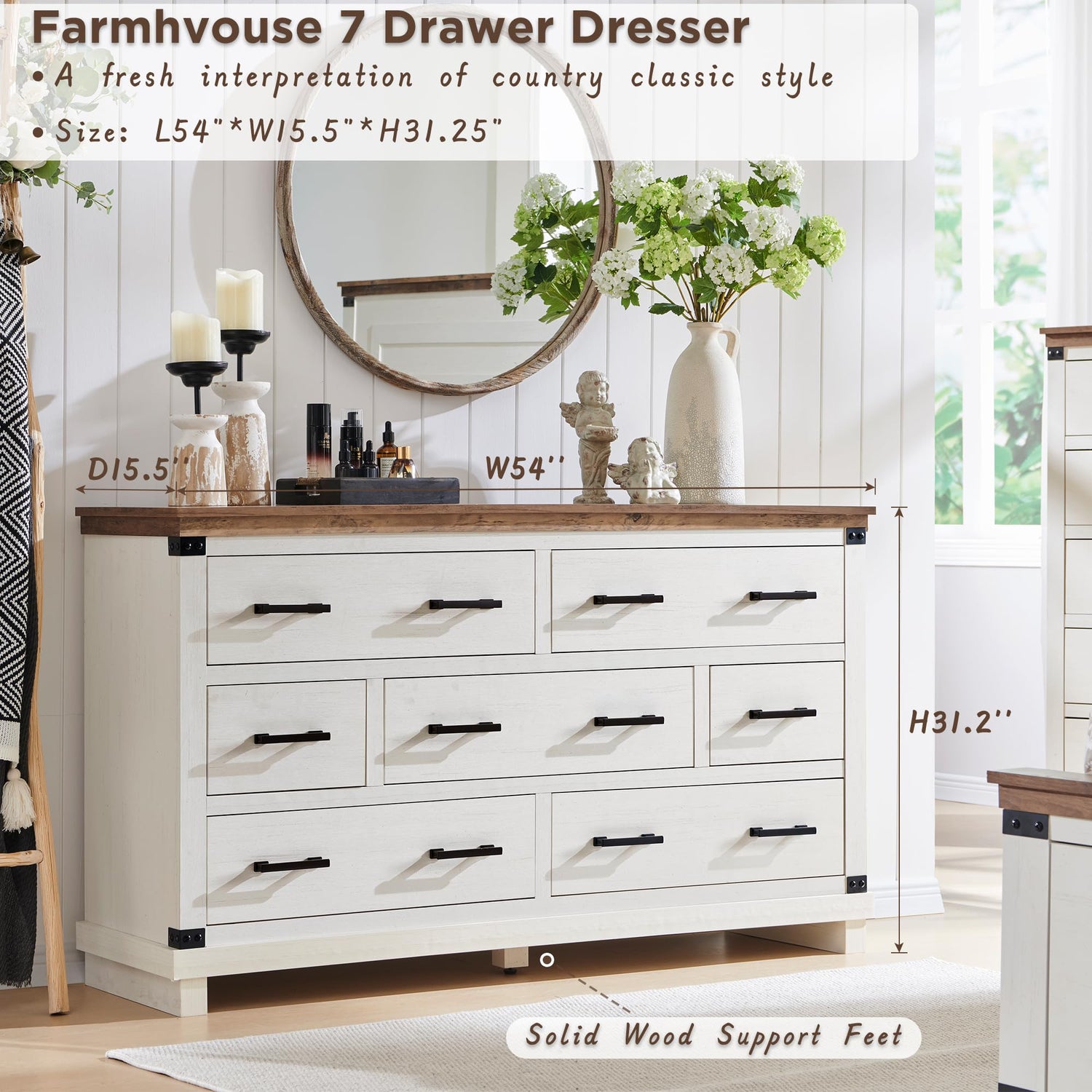Farmhouse 7 Drawers Dresser for Bedroom, Wood Large Chest of Drawers with Thick Plank Styling, Rustic Closet Dresser for Bedroom, Living Room, Antique White Color
