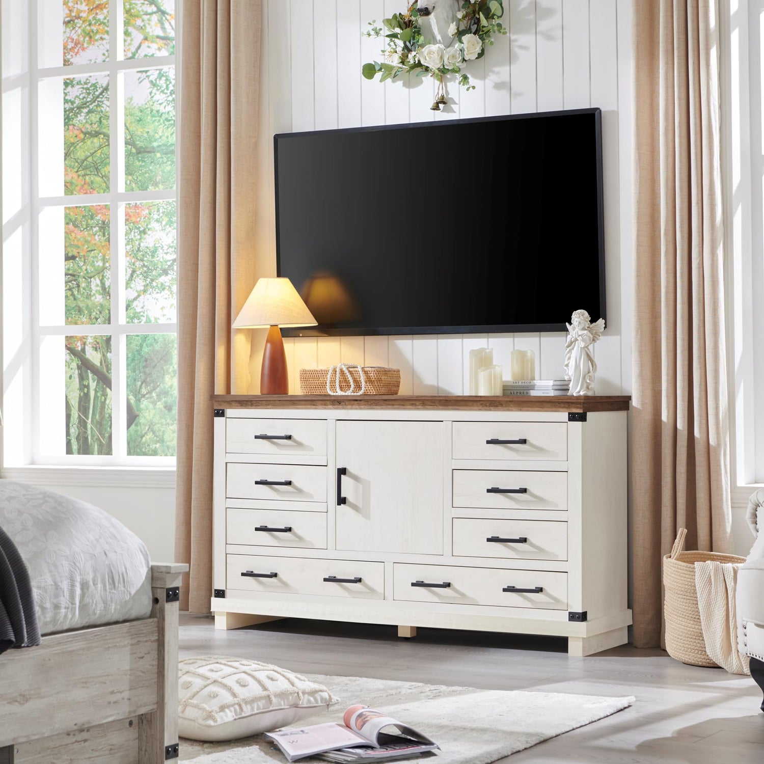 - Generous Storage Capacity: Measuring 54"L x 15.5"W x 31.25"H, this versatile tv stand dresser accommodates TVs up to 60 inches. With 8 smooth-glide drawers, plus a storage cabinet with adjustable shelf, it offers ample storage space for clothes, bedding, cosmetics, jewelry, and more. This multi-purpose large wood dresser adapts seamlessly to meet your bedroom storage needs, making it an essential addition to your home
