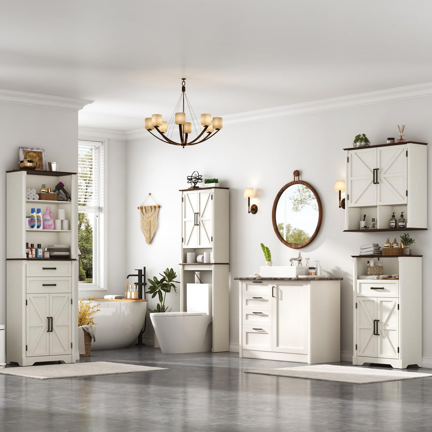 Farmhouse Bathroom Storage Cabinet,Double Wooden Bathroom Wall Cabinet with Roman Column Decor, Farmhouse Medicine Cabinets w Barn Doors,Storage Cabinets Wall Mounted for Kitchen(Rustic White)