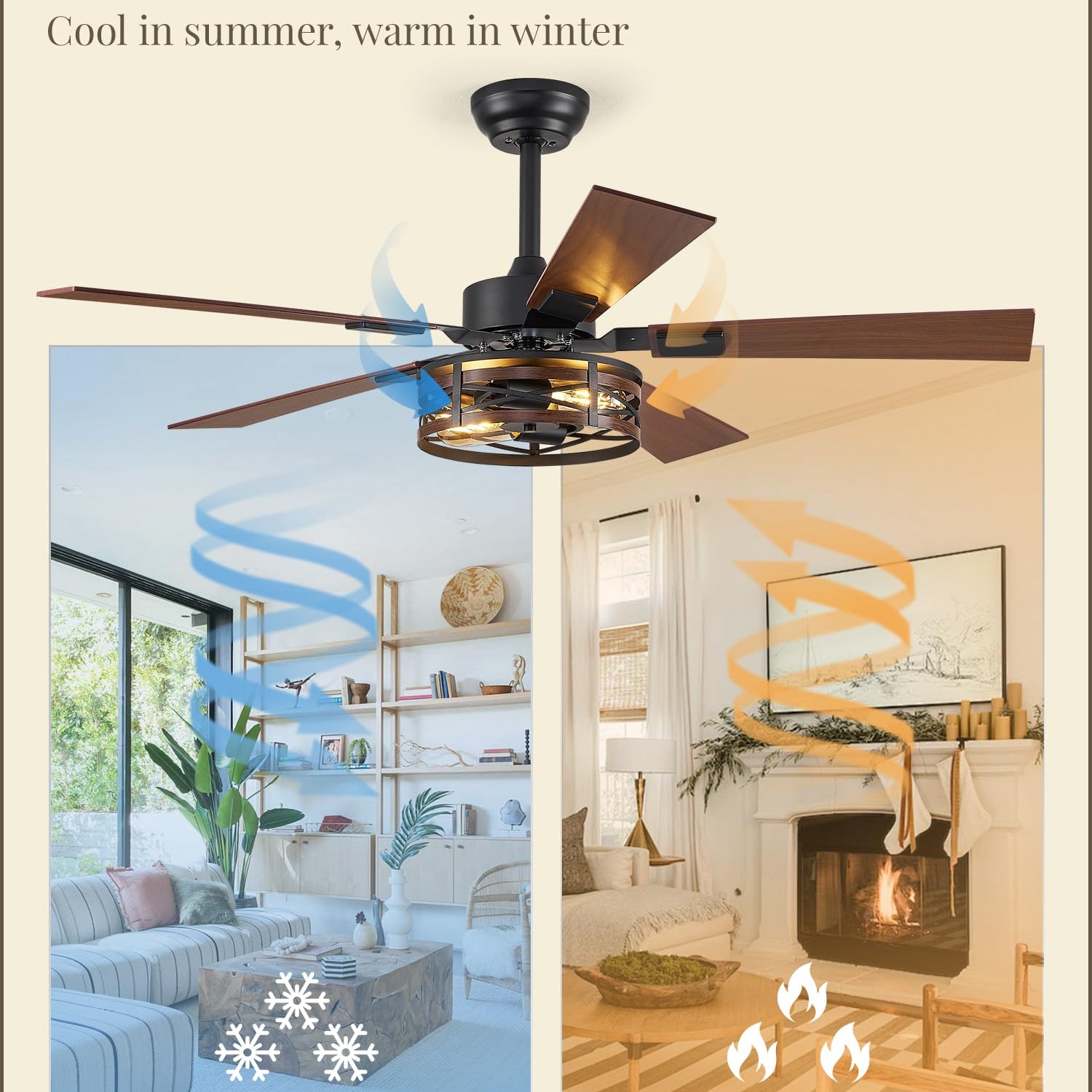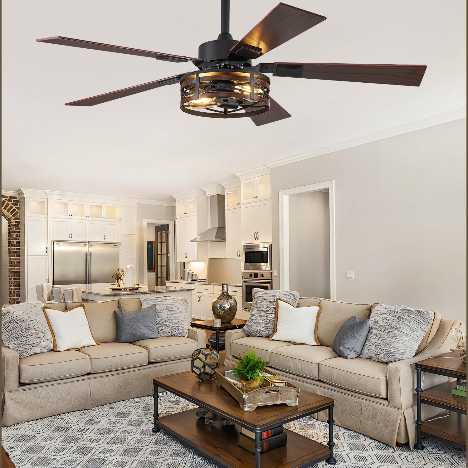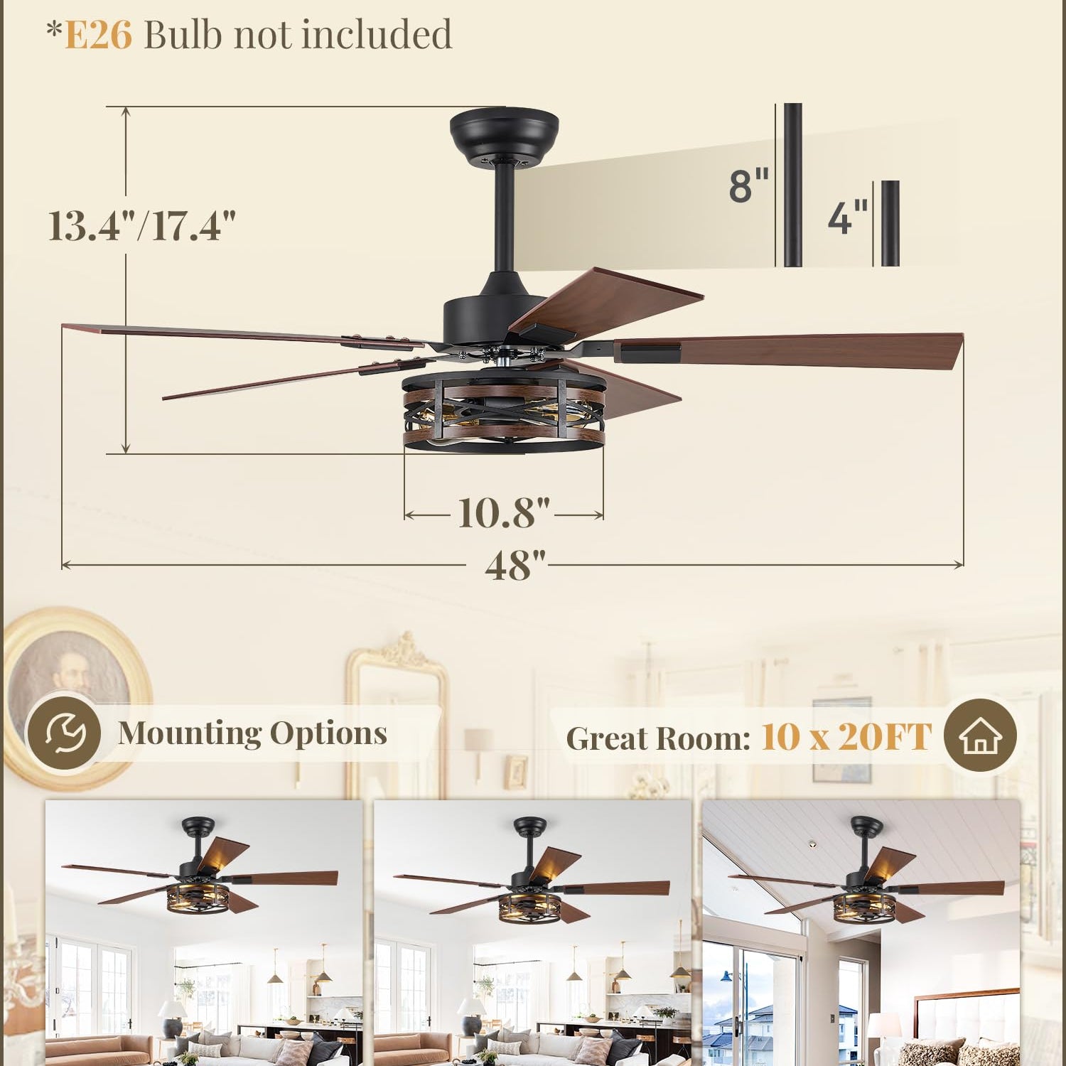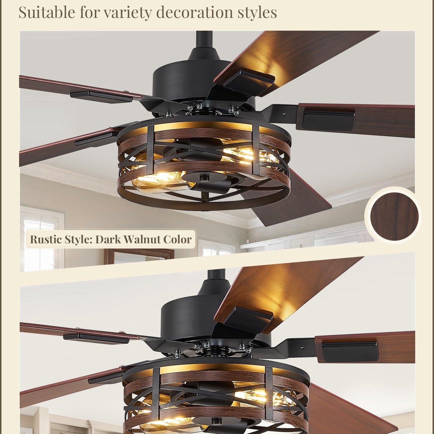 - Elegantly Designed Ceiling Fan: Embrace the charm of vintage farmhouse style with ceiling fan with light. Featuring innovative dual-color walnut blades and a decorative caged structure, you can effortlessly customize the look to complement your home decor. This industrial ceiling fan includes an E26 bulb base, compatible with most bulbs on the market, allowing you to choose the perfect lighting (bulbs not included). Ideal for multiple settings, the ceiling fan with remote enhances the ambiance of your living room, bedroom, kitchen, and more