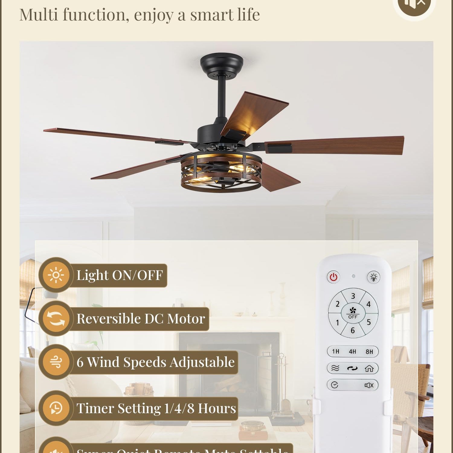 Farmhouse Ceiling Fans with Light, 48 Inch Bedroom Ceiling Fan with Lights, 6-Speed Adjustable, Quiet and Reversible DC Motor, Dual Finish 5 Blades, Rustic Caged Ceiling Fan for Living Room