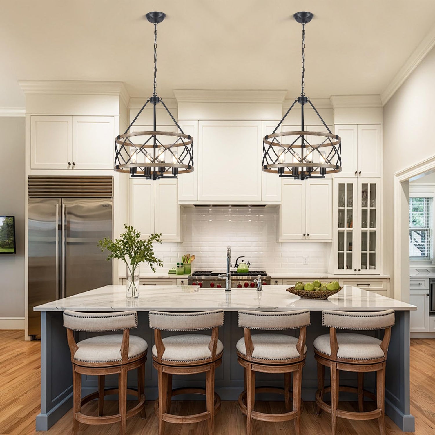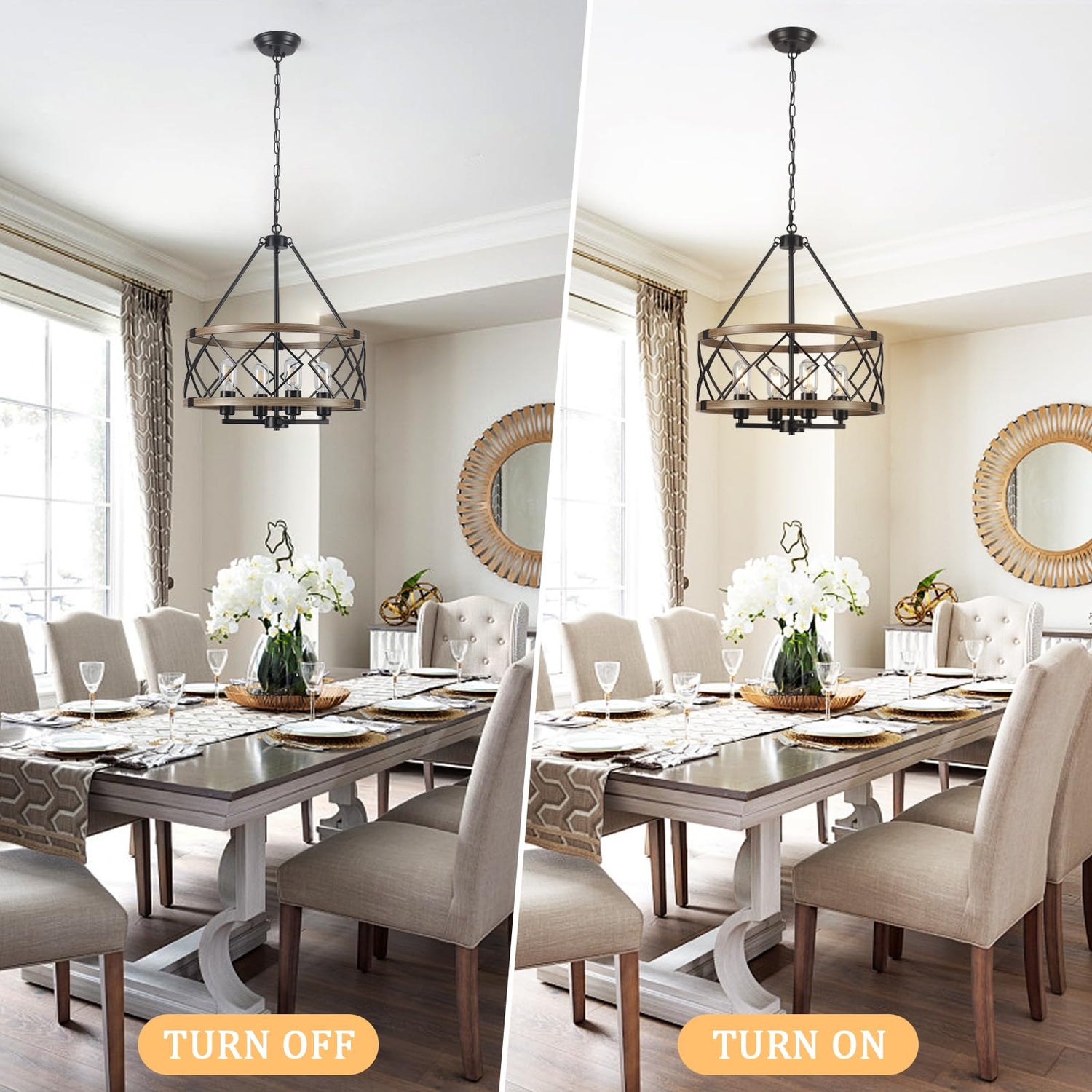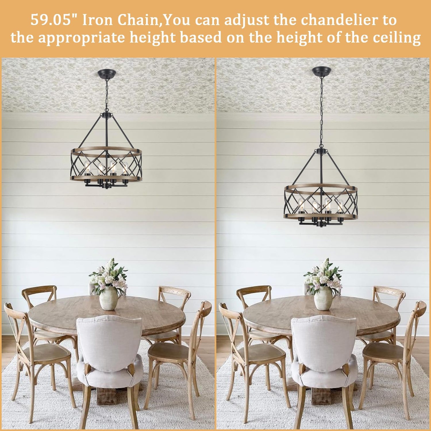 - Design concept: The rustic chandeliers with imitation wood veneer frame and black metal grid, pendant chandelier collocation, is the perfect combination of rural retro and modern home, high quality metal, high temperature rust treatment, stable structure, durable, emitting a lot of light at the same time to add a rustic beauty to your space.