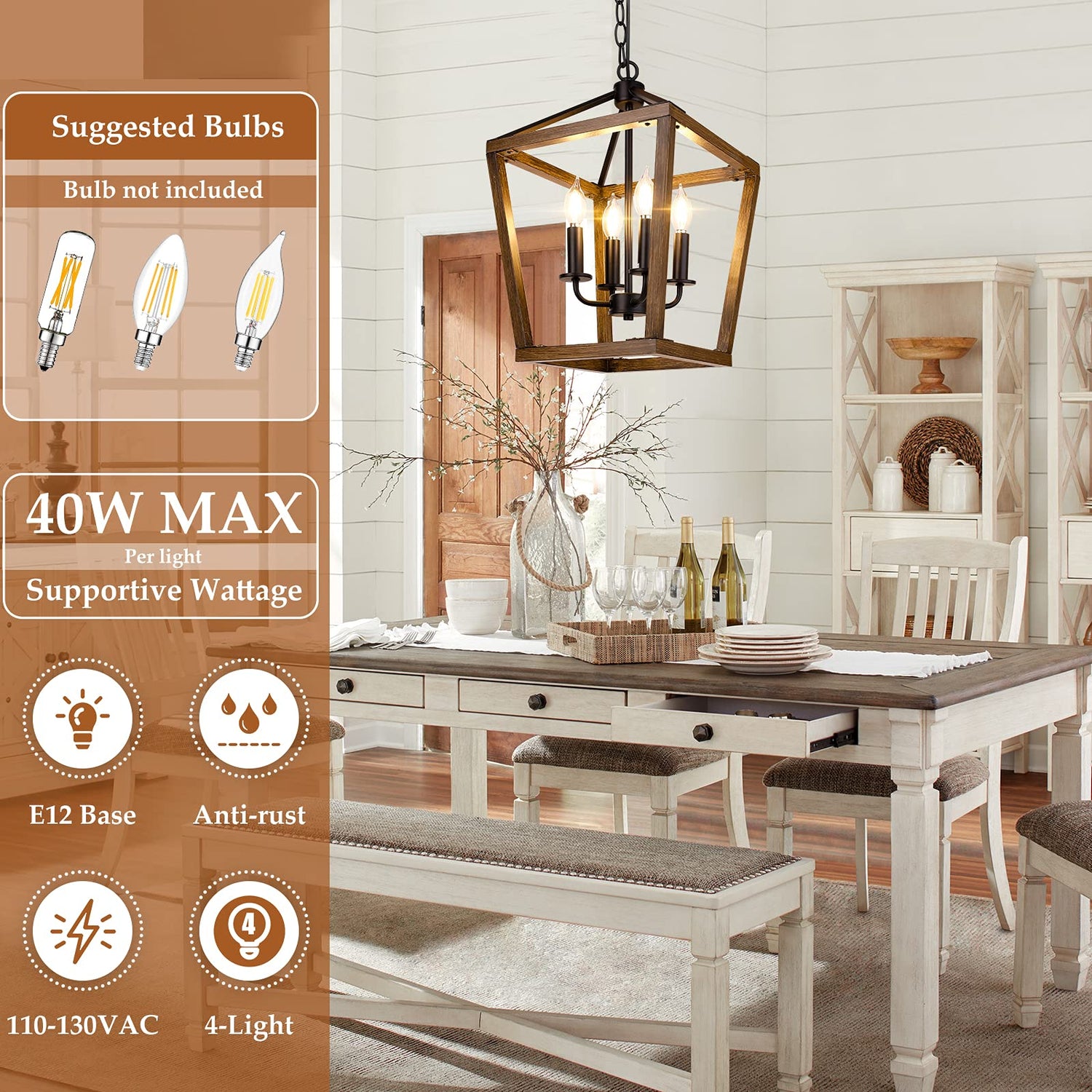 Details: Upgrade Your Dining Room with this Farmhouse 4-Light Chandelier Now! Sturdy Metal Construction in Wood-tone FinishThe chandelier is built with solid metal to ensure its long performance life. The hand-crafted wood tone finish resembles real oak wood and brings a rustic country flair to your lovely home. Height AdjustableDesigned with flexible chain instead of stiff rods, the chandelier light fixture goes well with both flat and sloped ceiling. There are 3 snap hooks on the 50in-long chain that let you customize the height of the chandelier to meet different mounting needs. You can either remove part of the chain or double back to make it shorter.Compatible with E12 Base Dimmable BulbsPut on 4 light bulbs with E12 base and the magic starts. You’ll find your place not only bright lit up but also properly decorated. You want to enjoy dimmable ambience? No problem. The chandelier is dimmable bulb and smart bulb compatible and that means you can easily set the tone you desire.
