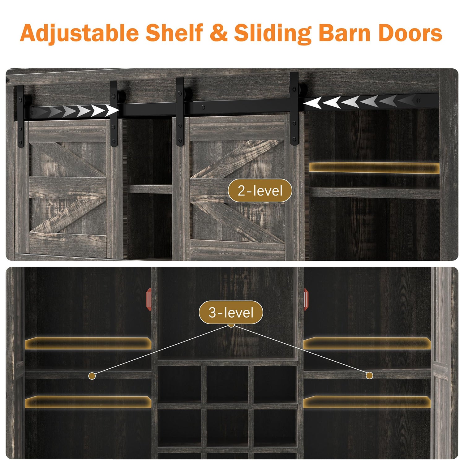 Farmhouse Coffee Bar Cabinet,72" Kitchen Hutch with Storage, Buffet Sideboard Cupboard with Adjustable Shelves, Sliding Barn Door, Wine & Glasses Rack for Kitchen, Dining Room, Dark Rustic Oak