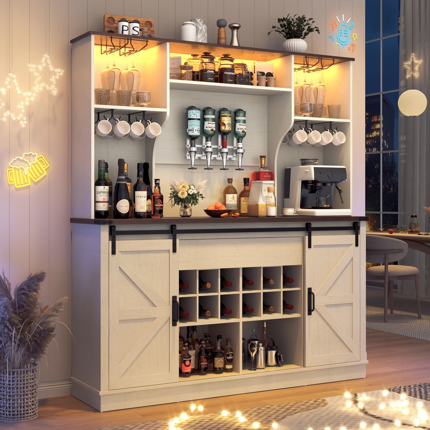Farmhouse Coffee Bar Cabinet with LED Light, Charging Station & Sliding Barn Doors - 63"W x 71"H Large Wine Rack, Built-in Liquor Dispenser, Glass/Mug Holders for Kitchen, Living Room, Hallway
