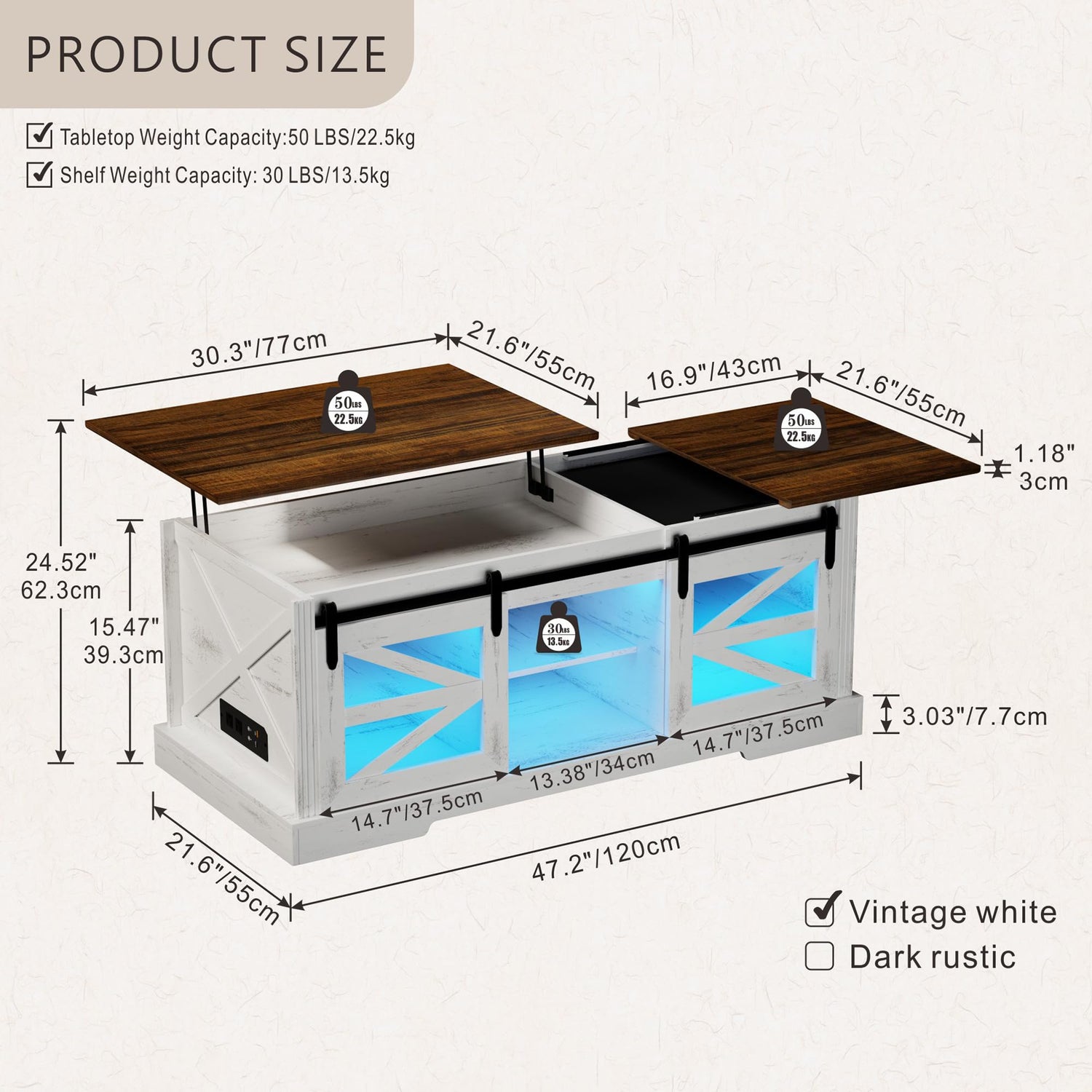Farmhouse Coffee Table, Lift Top Coffee Table with Gun Cabinet, 2 Sliding Barn Doors-Large Storage and 3 Color LED Lights fit Modern Rectangular Rustic Living Room Center Table,White