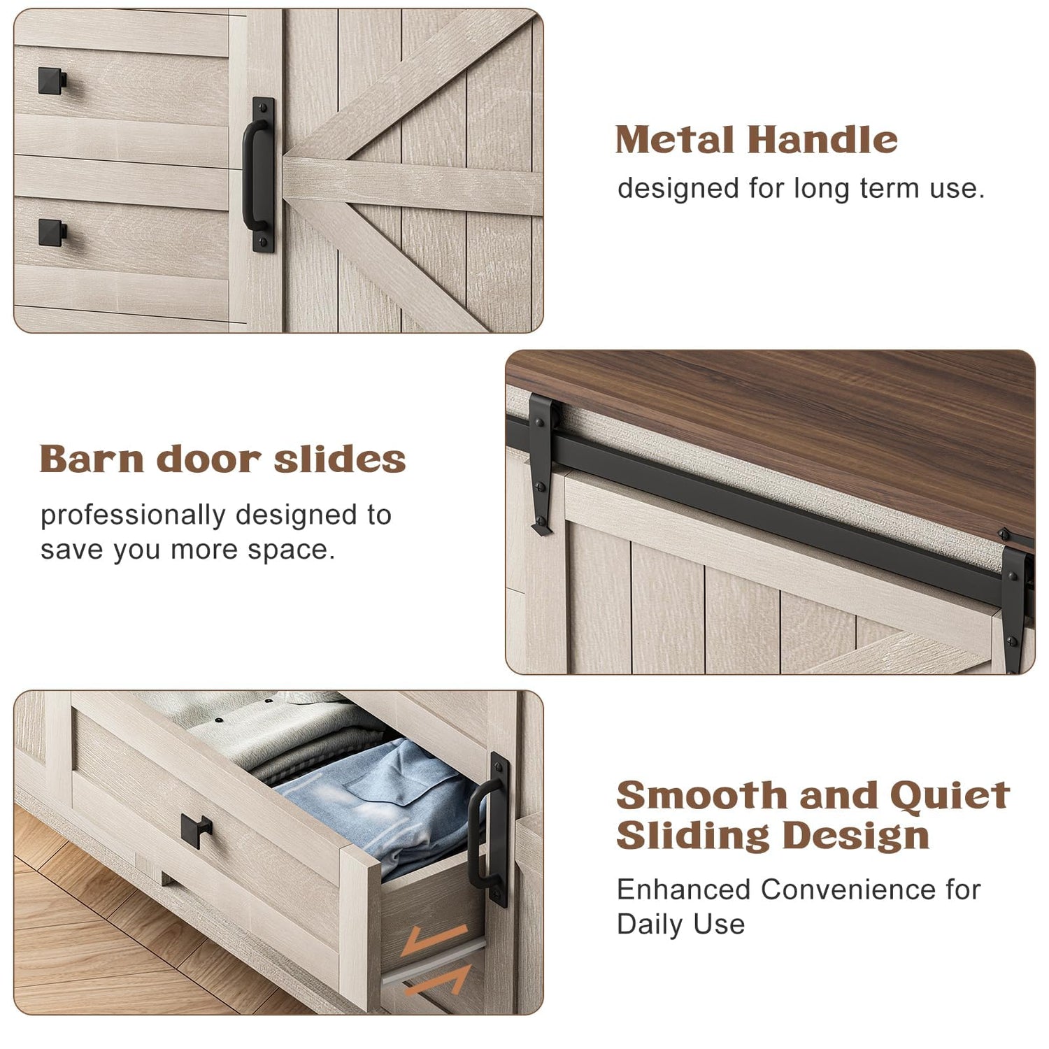 - Ample Storage with Farmhouse Charm: The antique brown cabinet top and birch bliss white barn doors exude vintage appeal, while the metal anti-collision corner guards add a touch of durability. With four spacious drawers and two sliding barn doors, this piece combines practicality with farmhouse-inspired style. Elevate your decor with this stunning 60"dresser that effortlessly captures the essence of rustic charm