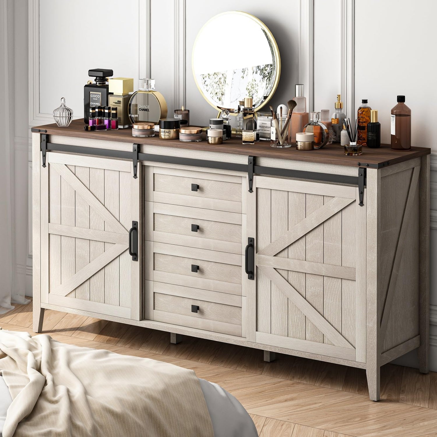 Farmhouse Dresser for Bedroom, Chests of Drawers for Clothes, 4 Drawers Dresser with Sliding Barn Door, White Dresser Wood, 60” Wide Dresser with Storage Organizer for Kids, Tall TV Stand