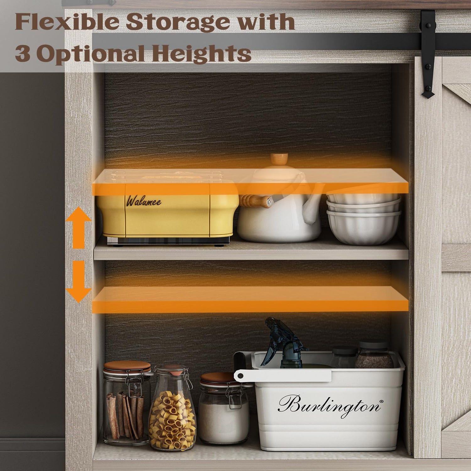 - Creative Barn Door Storage: Our innovative sliding barn doors effortlessly glide open to unveil adjustable shelves with three height options, offering versatile storage solutions. Plus, the removable shelf allows you to neatly arrange items of all sizes with ease