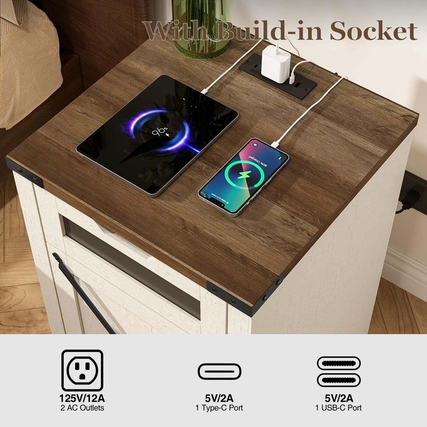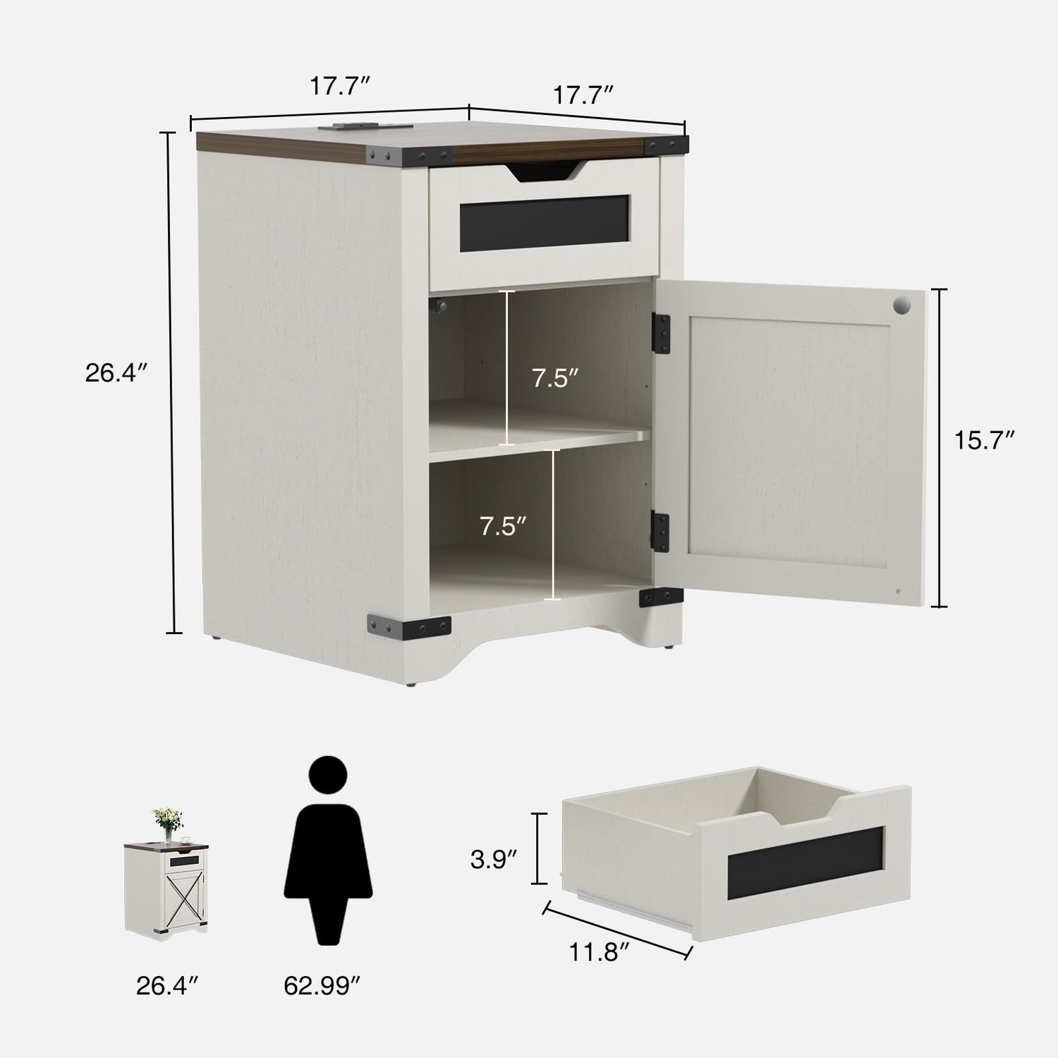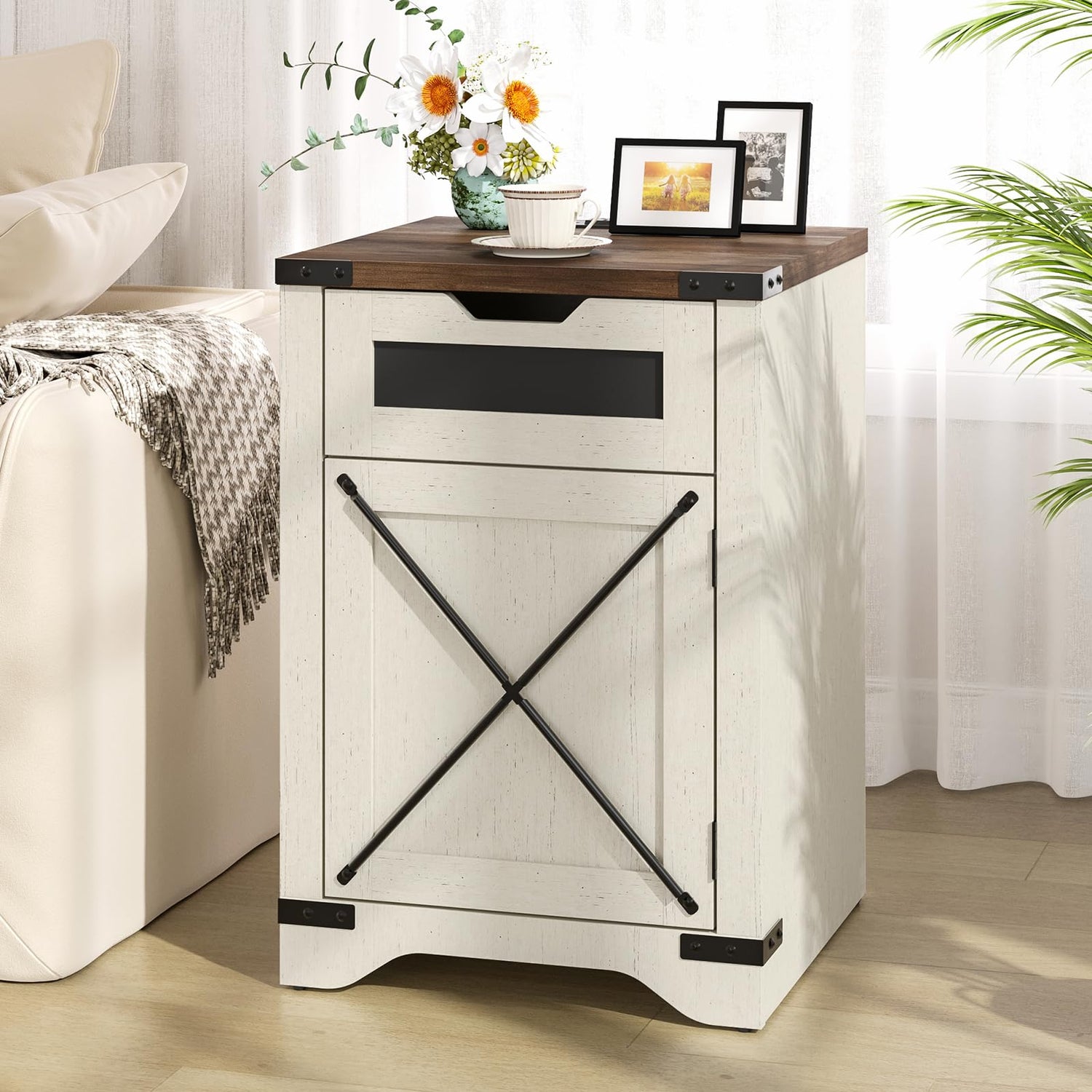 Farmhouse End Table with Charging Station, 26.4" H Side Table with Drawer and X Barn Door, Antique White Country Nightstand Bedside Table, Mid Century Modern Sofa Side Table for Living Room