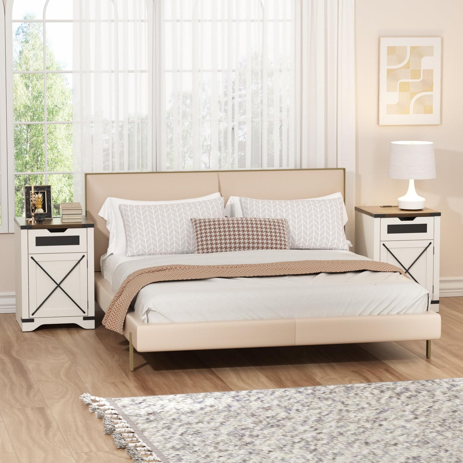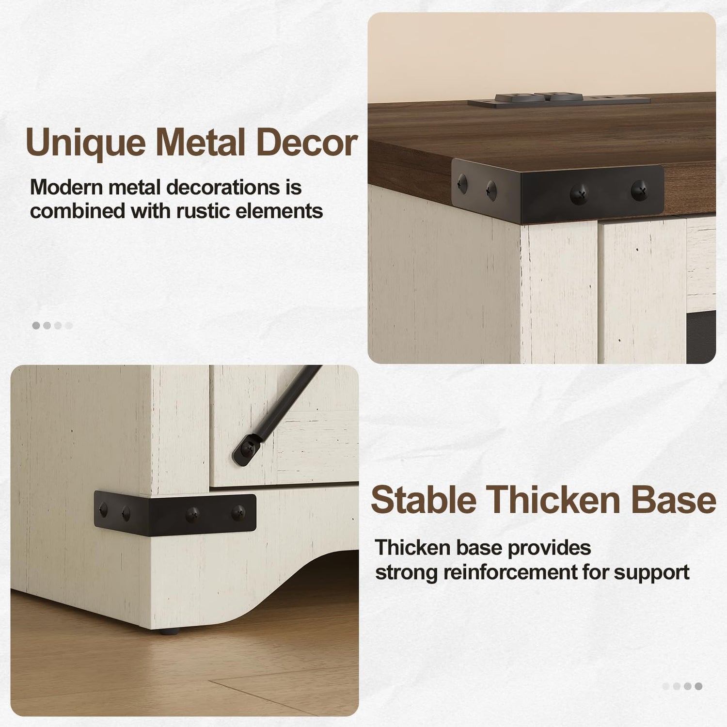 - Chic Farmhouse End Table: The antique white rustic nightstand features a unique Ironwork XX barn door design. Decorative black metal at the corners adds a premium touch to the sideboard. It is a great combination of modern country and vintage farmhouse style. The classic antique white woodgrain finish restores the texture of the original wood and complements any room furniture and decor