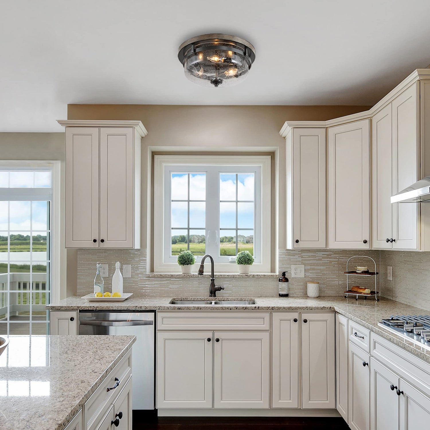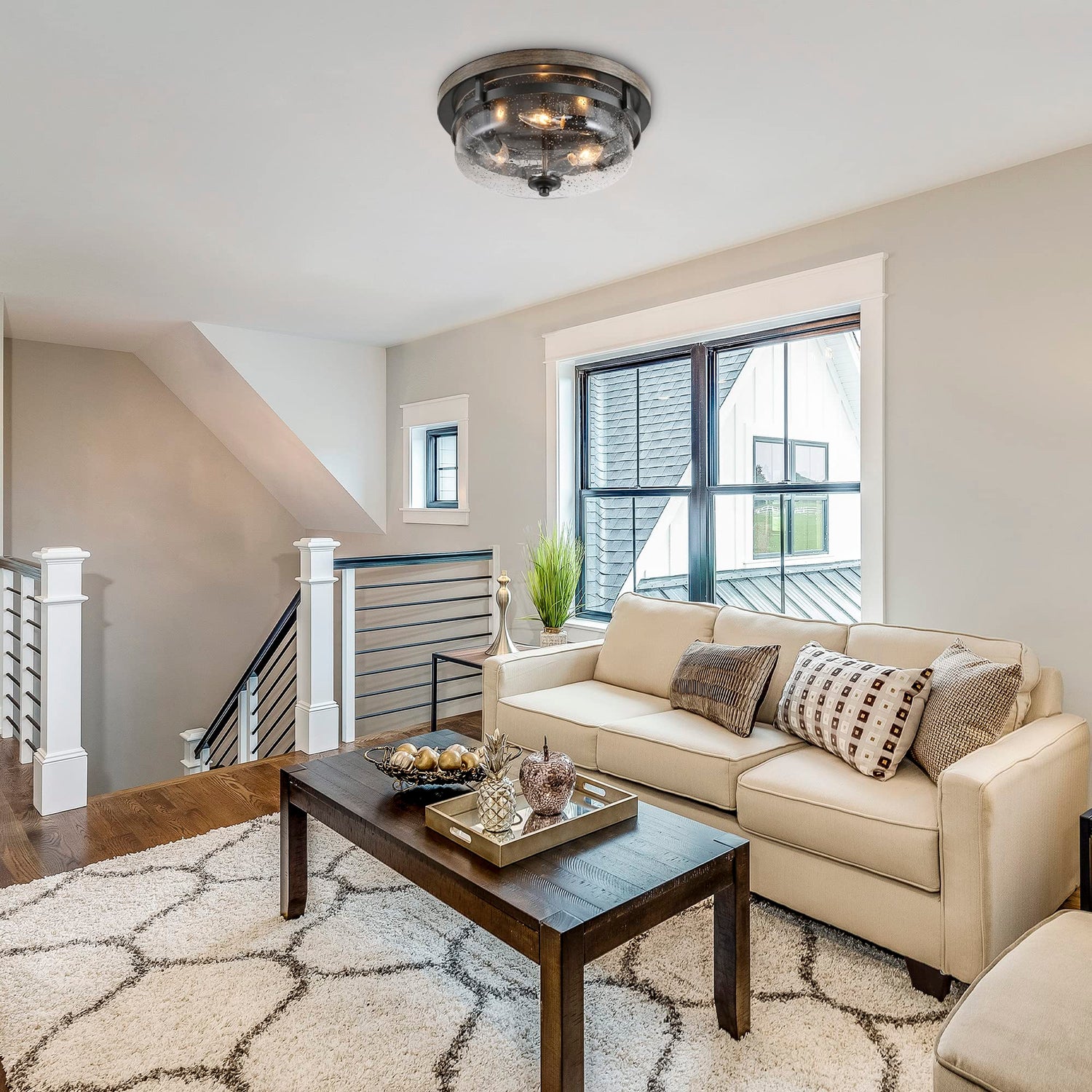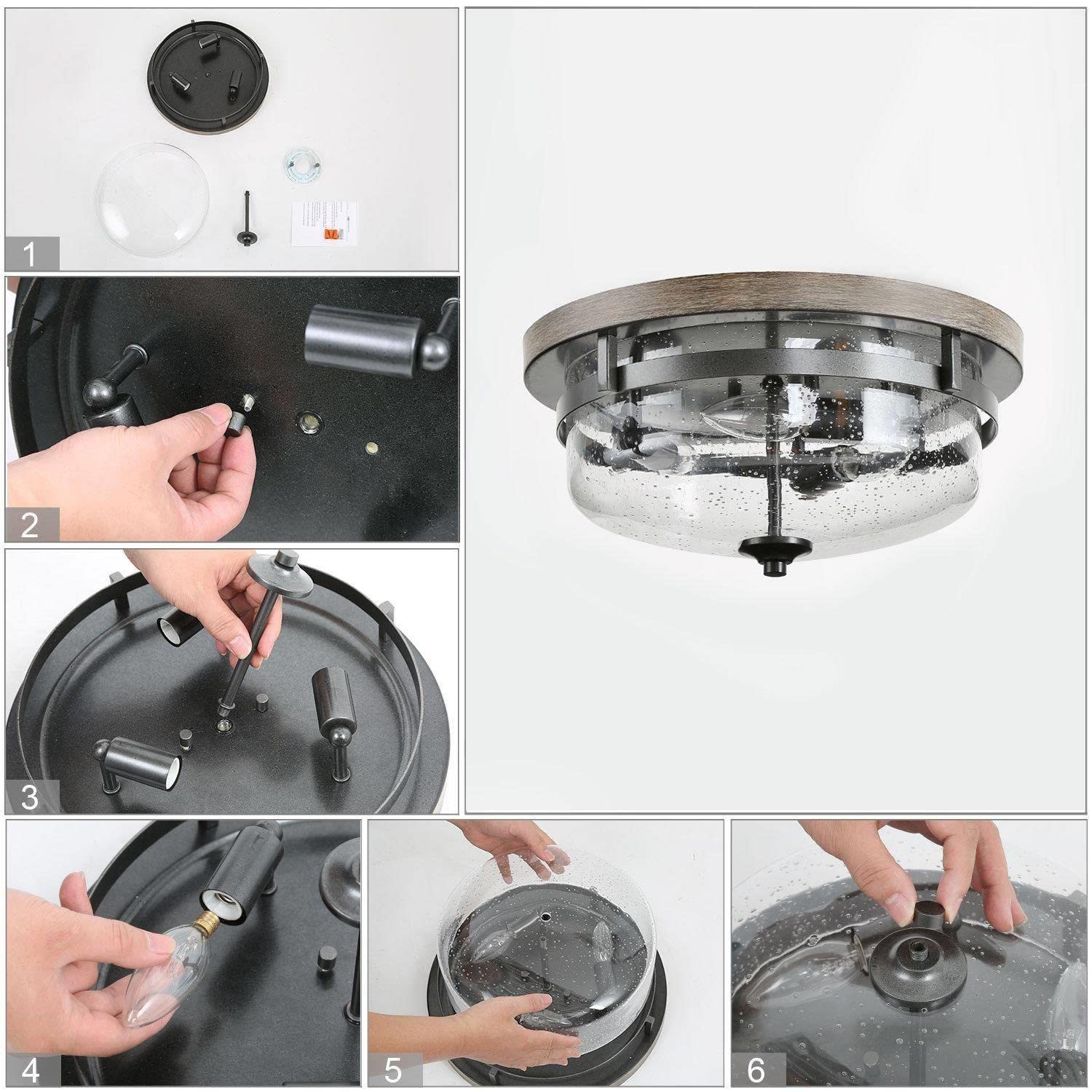 - [Modern Farmhouse Appeal] This charming flush mount ceiling light combines faux wood metal finishes and a glass design to create a captivating modern farmhouse aesthetic. It showcases a seeded cover enclosed in a faux wood canopy, accentuated by hand-treated black metal bands, blending farmhouse charm with a modern touch. The ceiling light features three outspread light arms at its center, providing an elegant shine and ample ambient glow for various spaces like bedrooms, kitchens, entryways, hallways, and bathrooms.