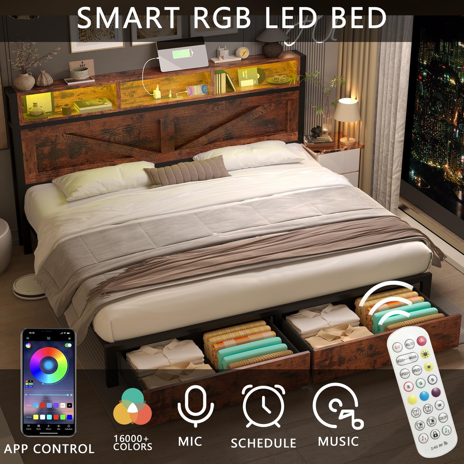 Farmhouse King Bed Frame with Bookcase Headboard and Storage Drawers, LED Lights and Charging Station, No Box Spring Needed, Noise Free, Rustic Brown