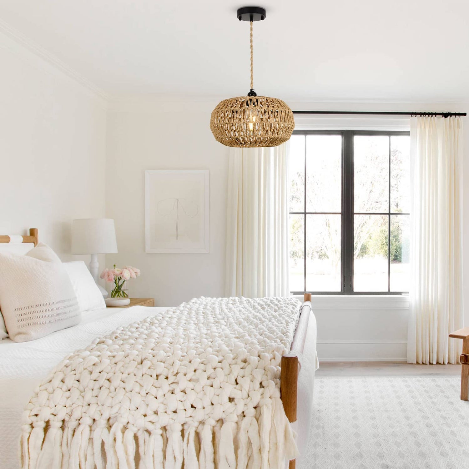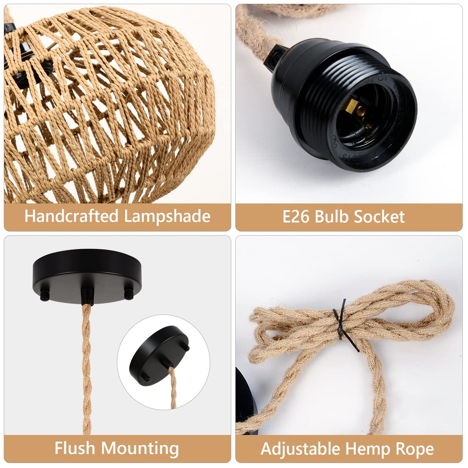 - ❤【Bohemian Design & Eco-friendly】Our rattan pendant light is made of 100% hand-woven natural rattan wrapped around a metal cage, assembled with hemp rope cord, selected natural rattan makes the woven light fixture more eco-friendly and durable. The unique shape of the wicker lamp creates a farmhouse, bohemian style. When lit, the light from the shade projects a very beautiful pattern on the wall! This pendant light fixtures is the best choice for decor or gift to your friends and family!