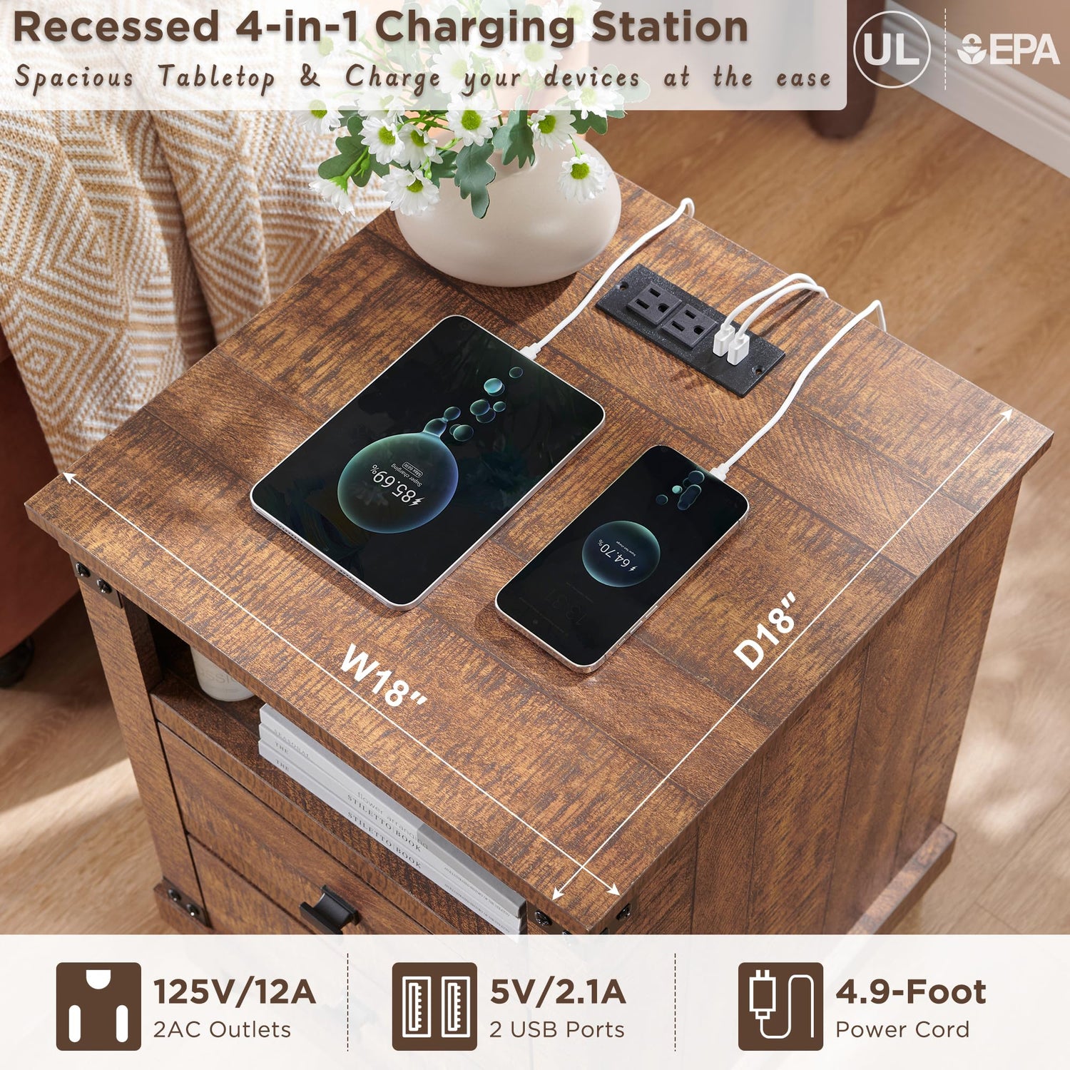 Farmhouse Nightstand with Charging Station, 18" Rustic Night Stand with 2 Storage Drawers, Wood End Table for Bedroom, Living Room, Reclaimed Barnwood