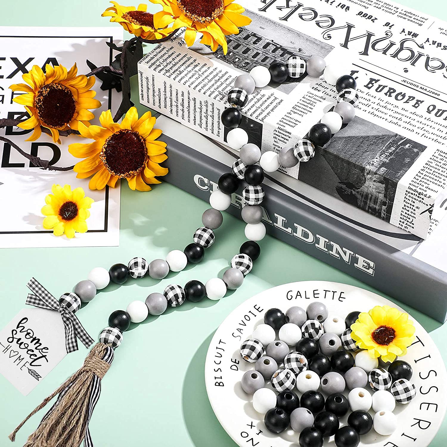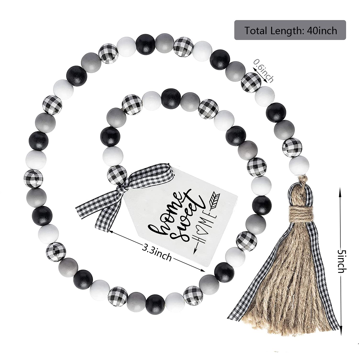 - Include: 1 pack black & white buffalo plaid wooden beads garland with jute tassel and wooden home sign.